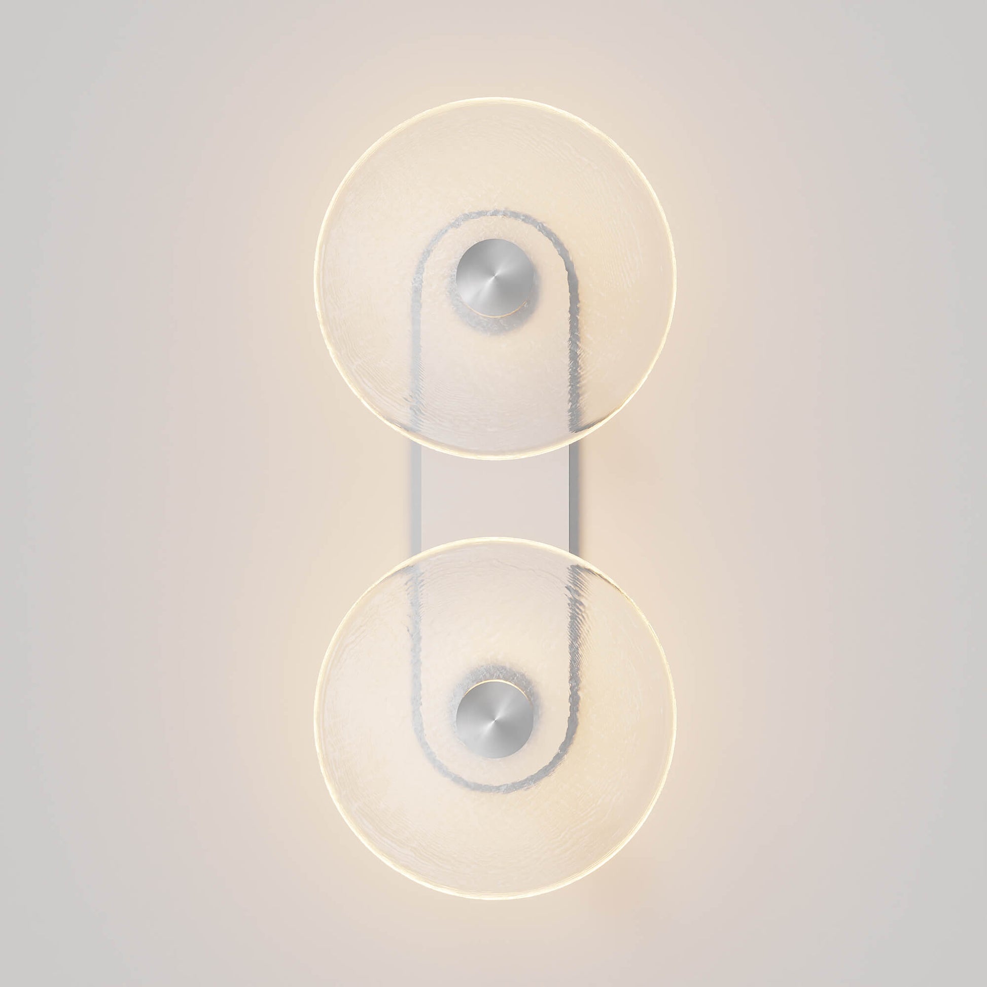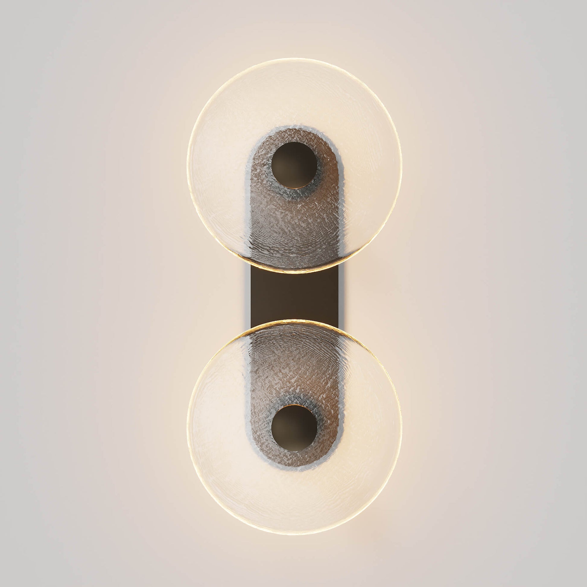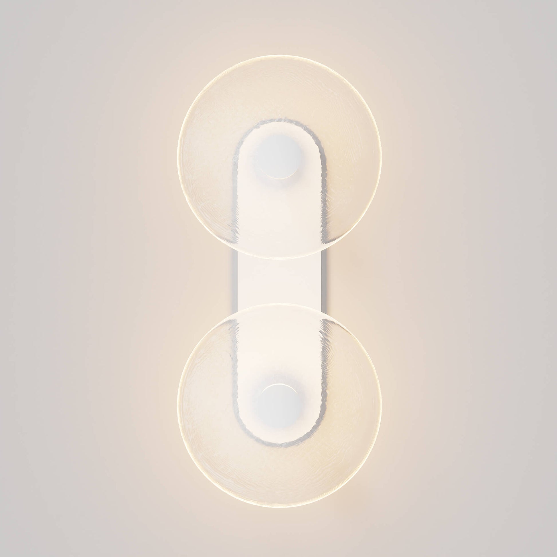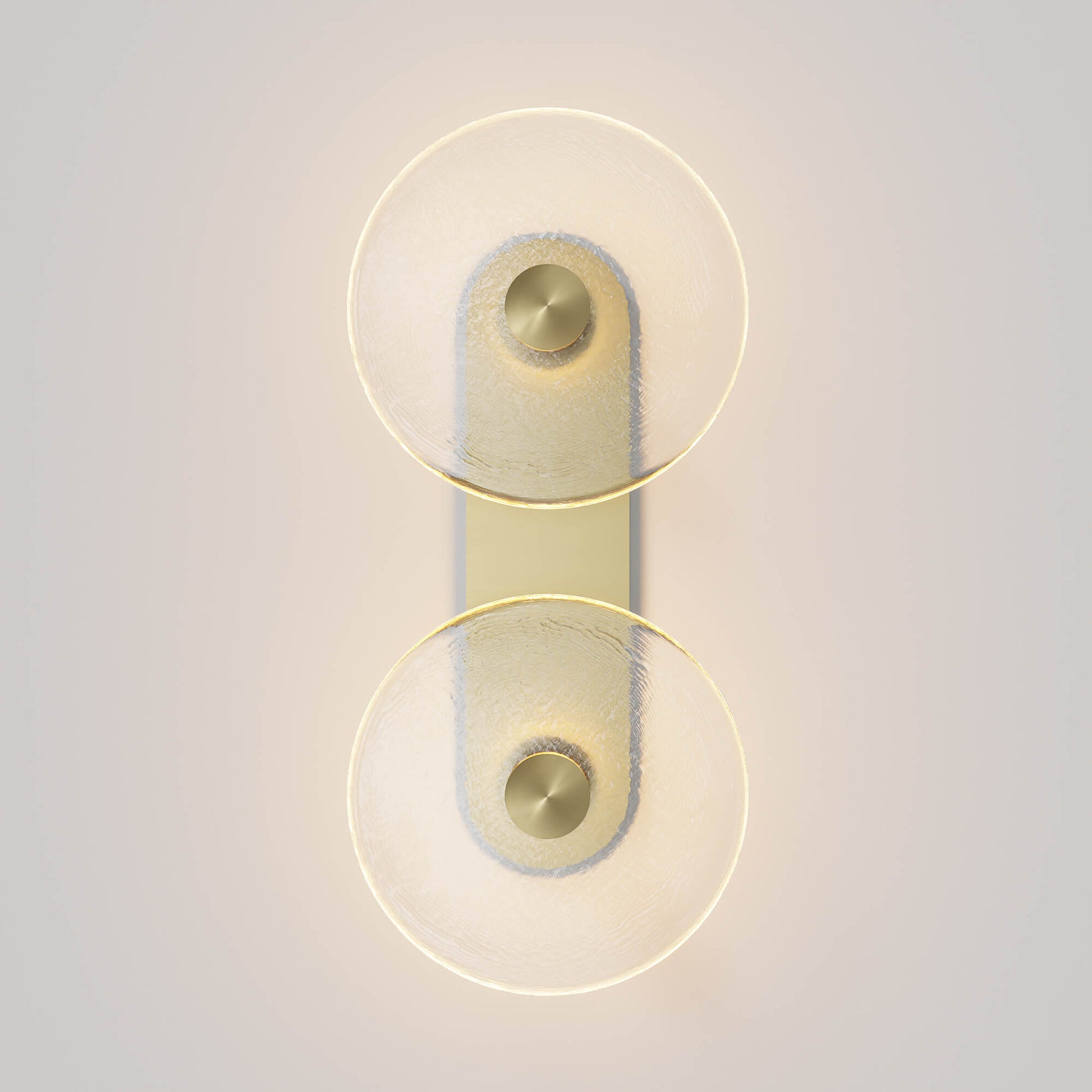 Embellish your walls with the Coral Duo wall light and add a modern contemporary feature ideal for kitchens, bedrooms, bathrooms and entryways. This statement piece features two hand-blown glass discs available in both clear and frosted finishes. Tailor it to your preferences by selecting a wall plate finish of brass finish, matte black, matte white, medium bronze or steel finish and set the mood of your space with a choice of warm, warm white, or white LED temperatures. Meticulously hand-blown using premium Swedish clear glass, each disc carries the distinctiveness of SOKTAS Glass designs, promising an unparalleled and personalised lighting masterpiece that adds both elegance and character to your space.