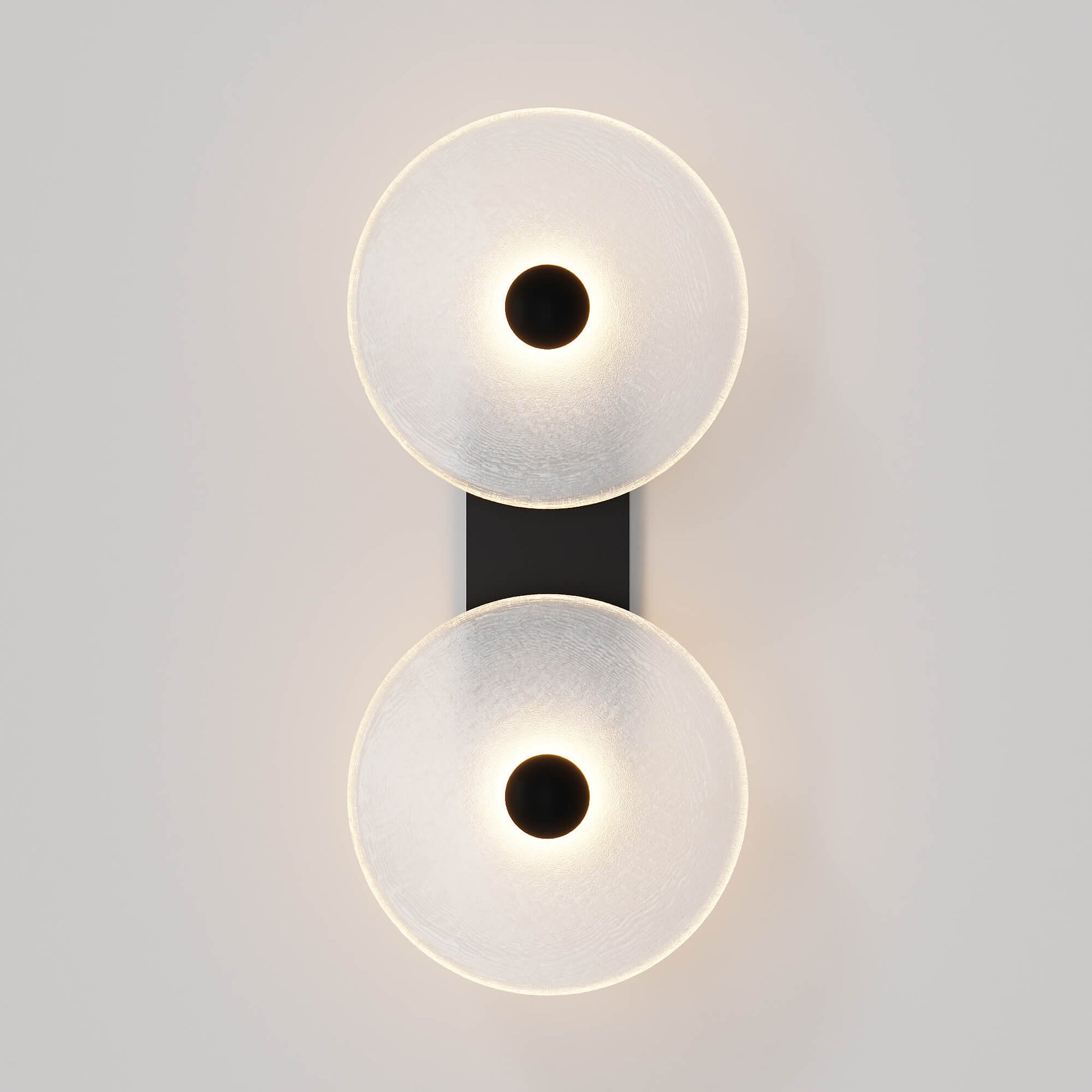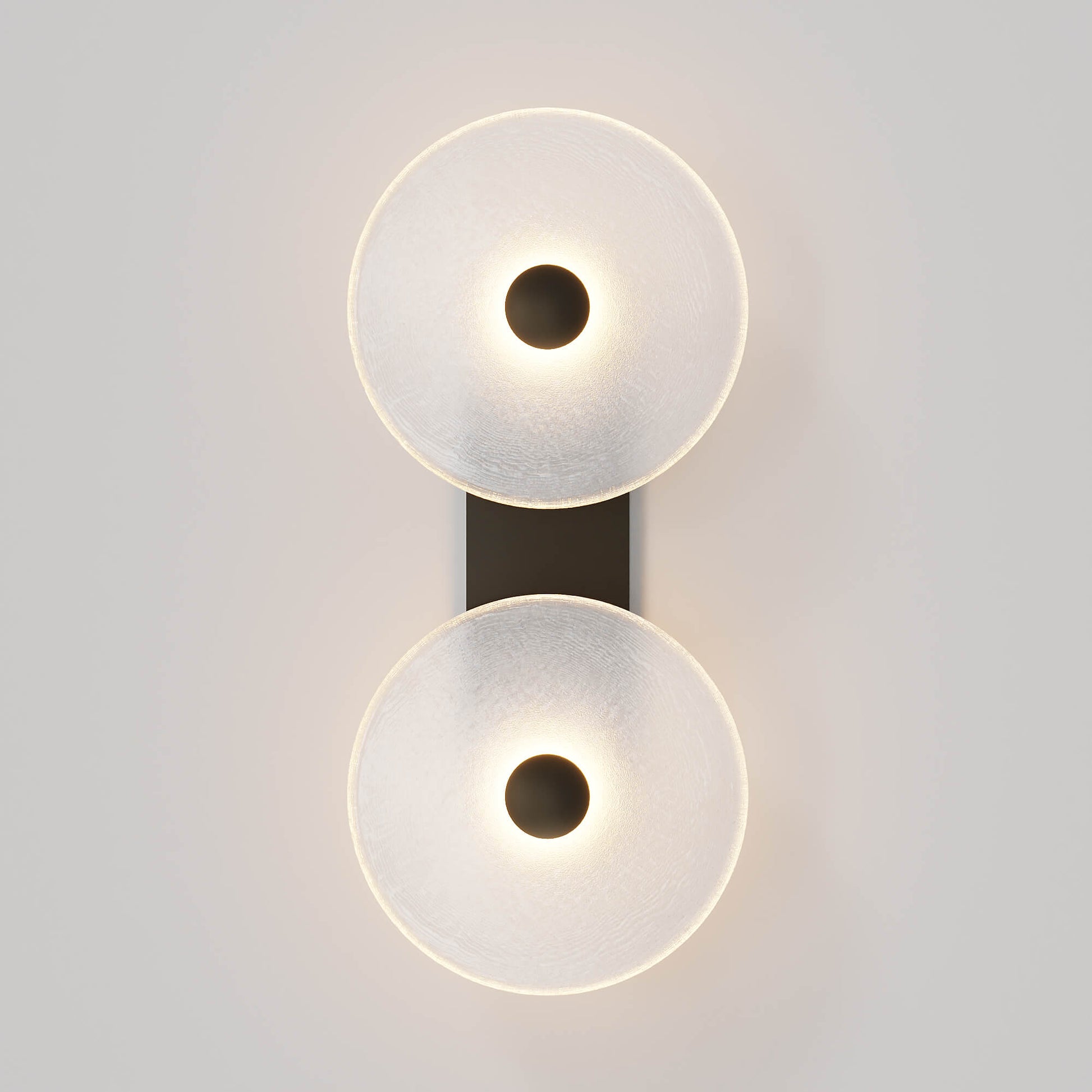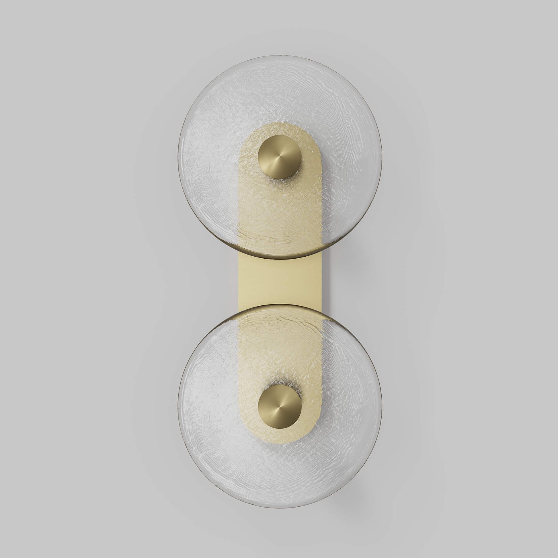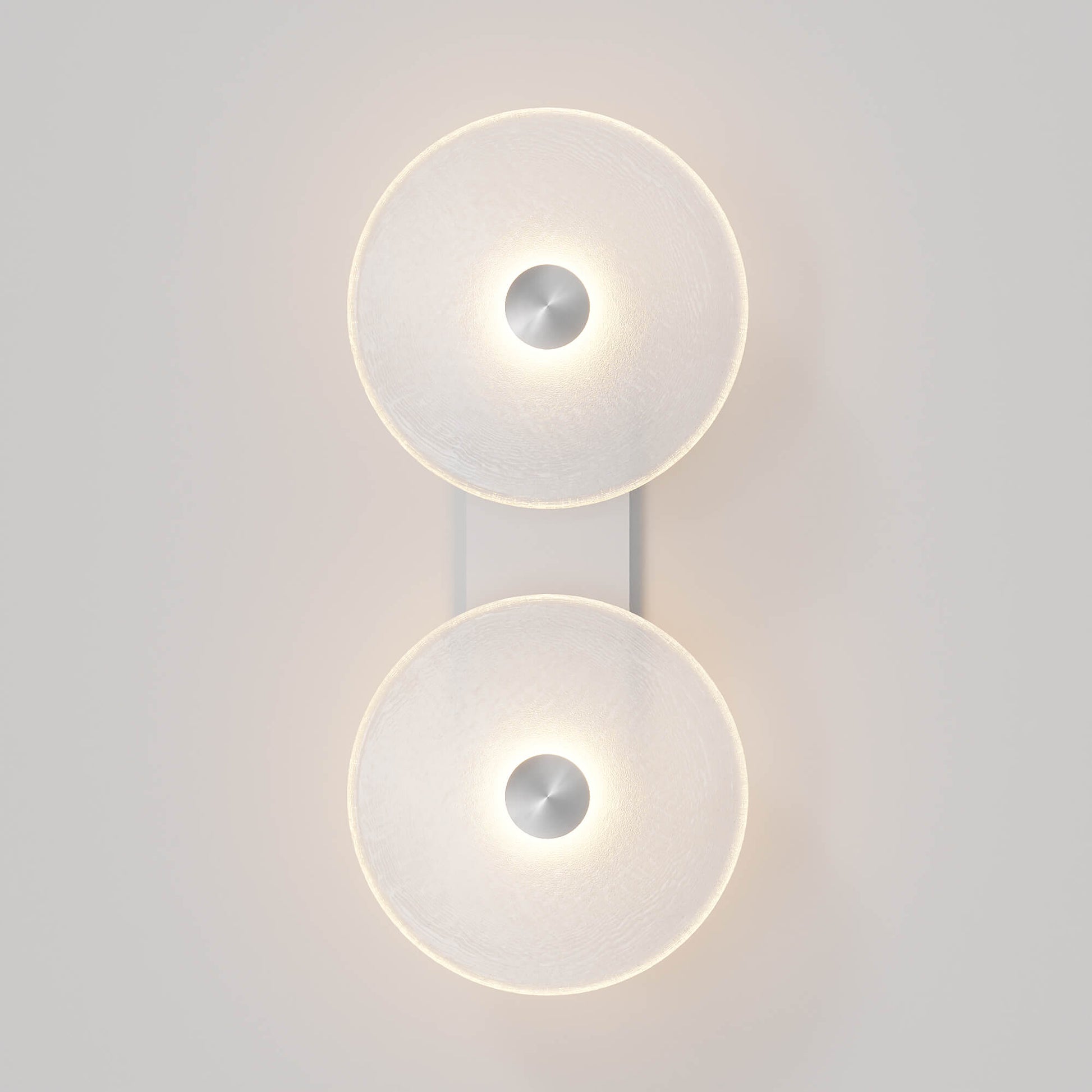 Embellish your walls with the Coral Duo wall light and add a modern contemporary feature ideal for kitchens, bedrooms, bathrooms and entryways. This statement piece features two hand-blown glass discs available in both clear and frosted finishes. Tailor it to your preferences by selecting a wall plate finish of brass finish, matte black, matte white, medium bronze or steel finish and set the mood of your space with a choice of warm, warm white, or white LED temperatures. Meticulously hand-blown using premium Swedish clear glass, each disc carries the distinctiveness of SOKTAS Glass designs, promising an unparalleled and personalised lighting masterpiece that adds both elegance and character to your space.