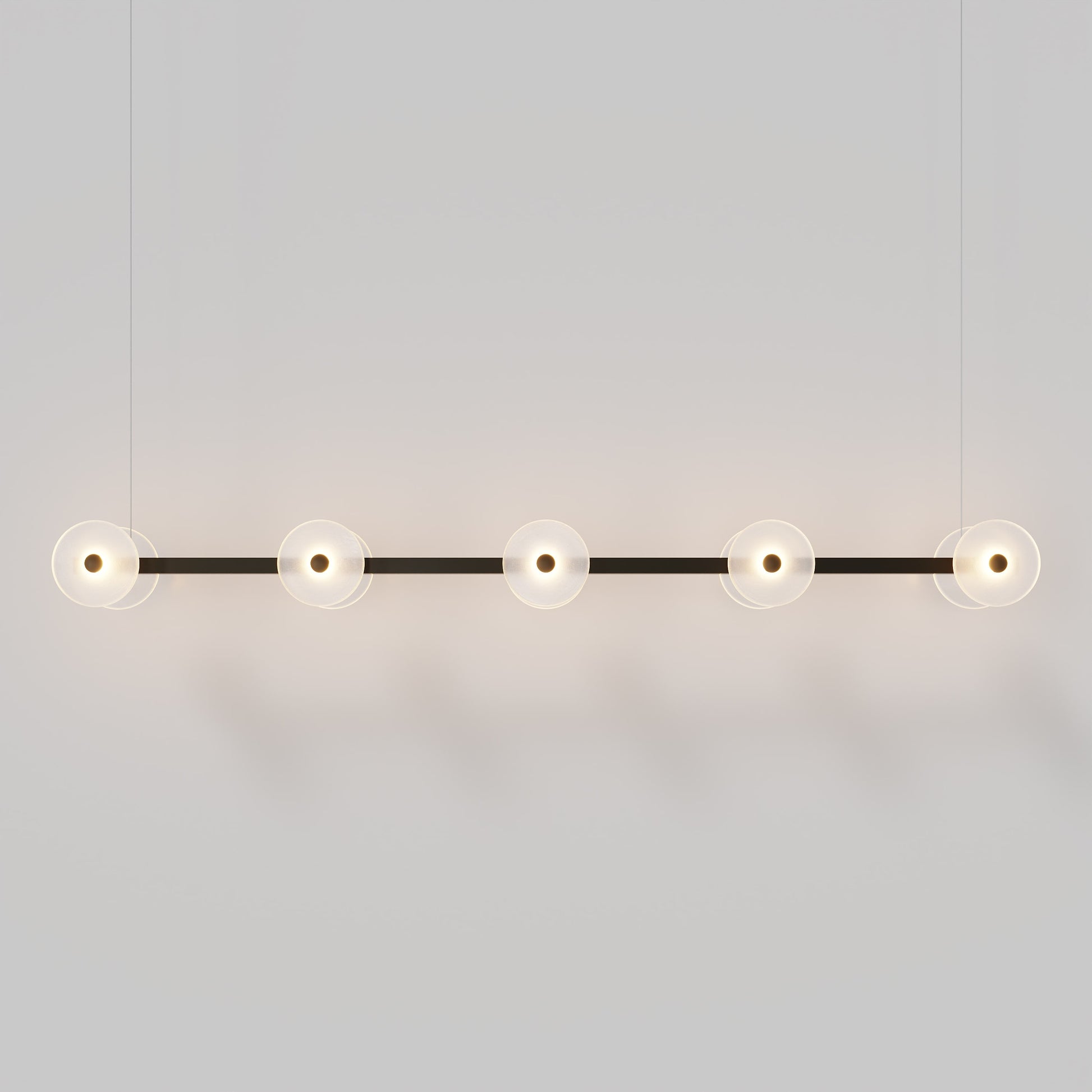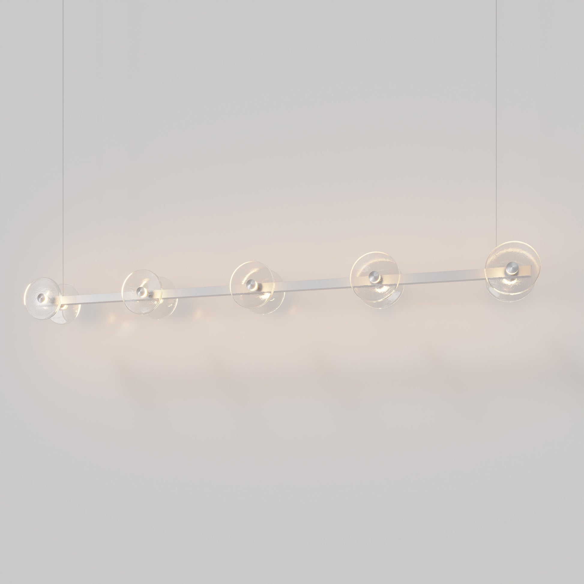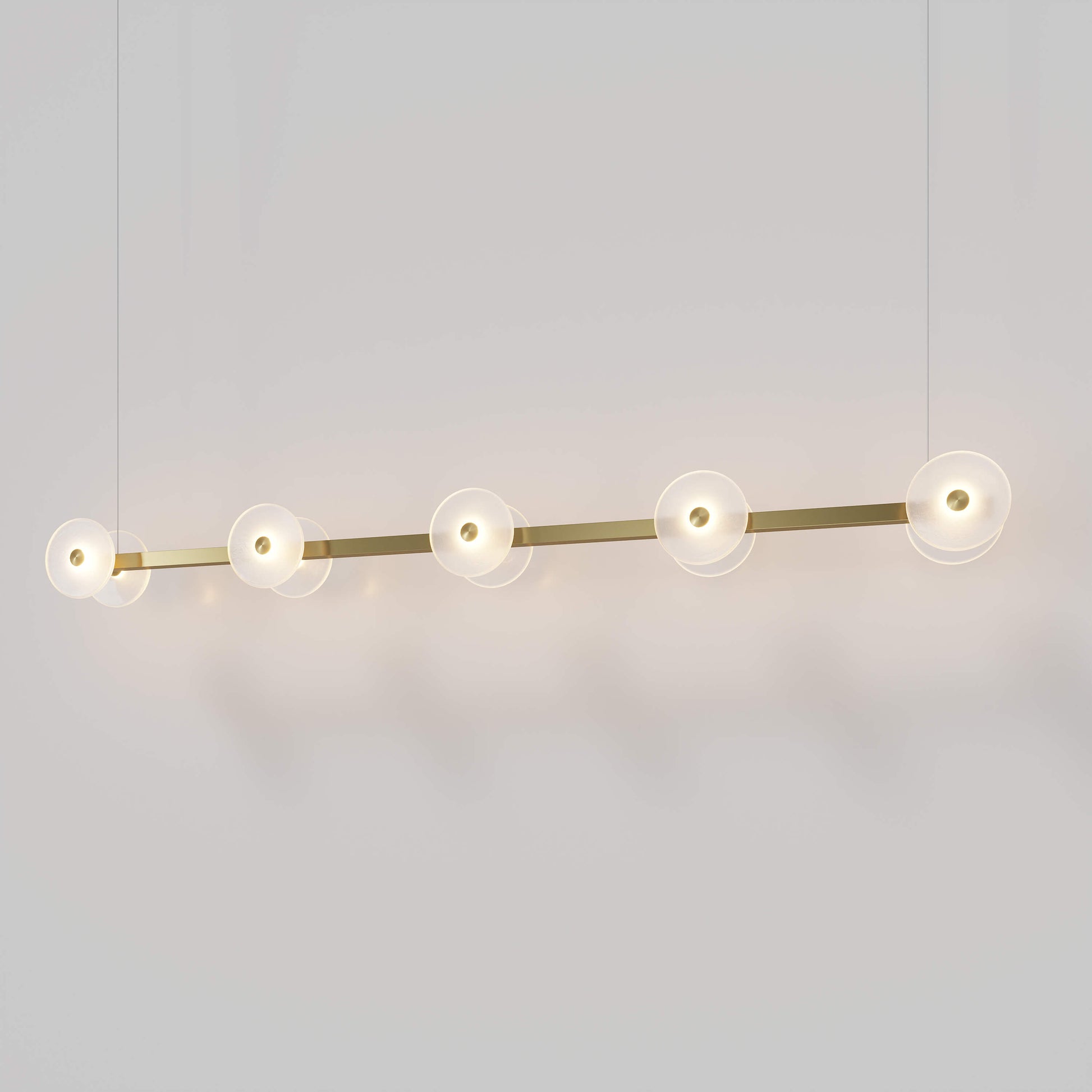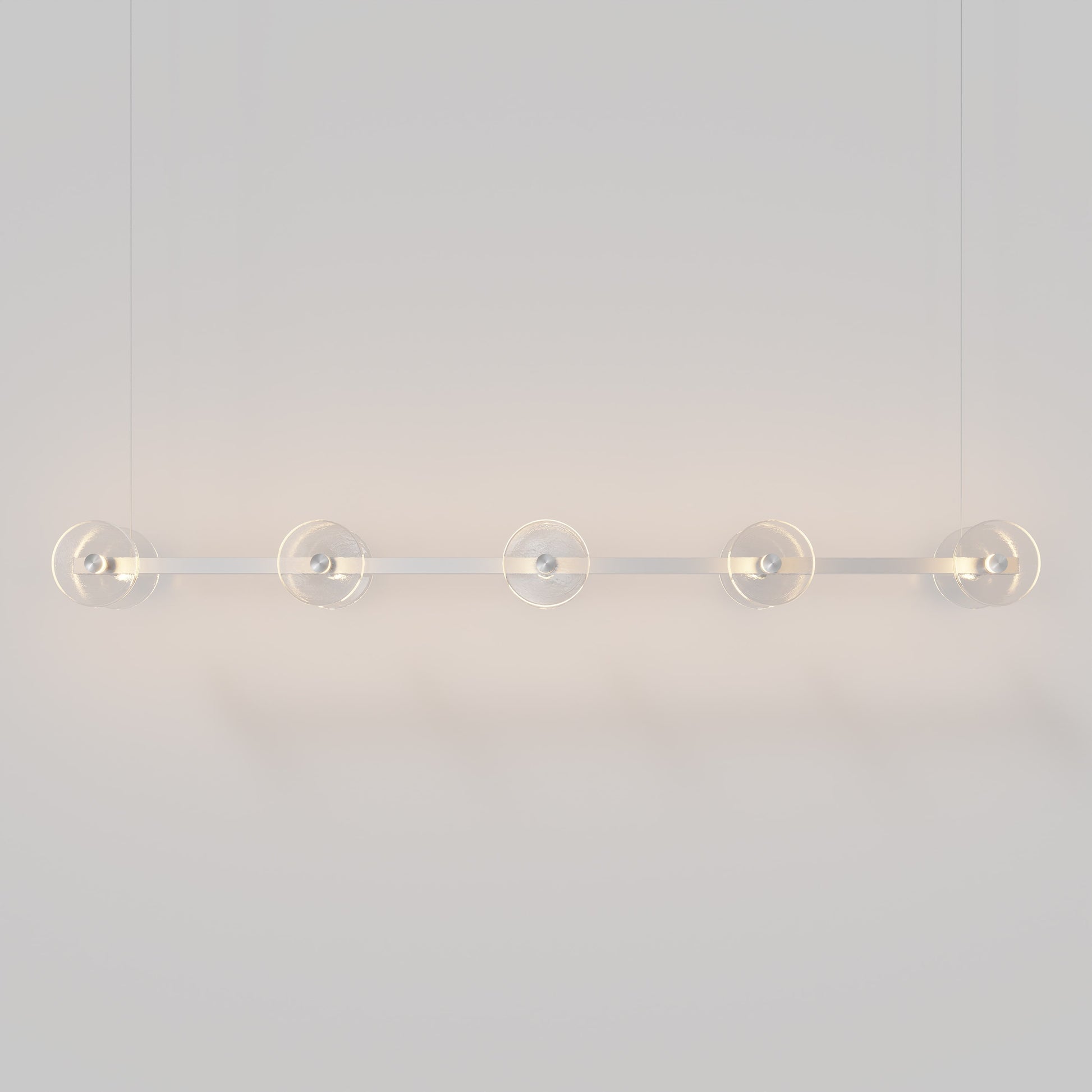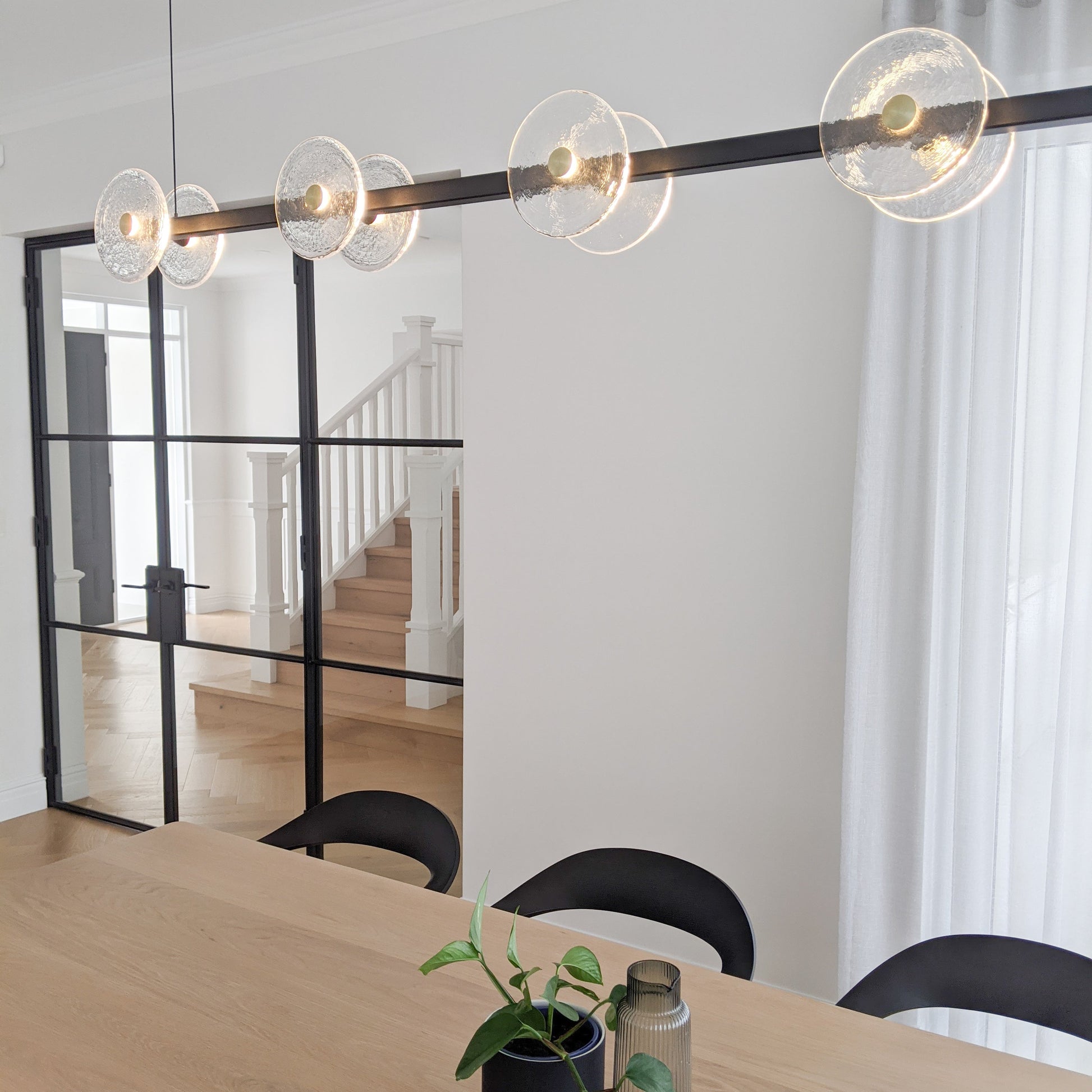 Add a feature piece to your space with the Coral Linear Bar pendant light, a beautiful modern centrepiece perfect for dining tables, kitchen islands and elegant office spaces. Featuring ten unique glass-blown discs suspended on a rod available in a selection of finishes including brass finish, steel finish, matte black, matte white, or medium bronze powder coating. Choose from a frosted or clear finish and set the mood of your space with a choice of warm, warm white, or white LED temperatures. Meticulously hand-blown using premium Swedish clear glass, each disc carries the distinctiveness of SOKTAS Glass designs, promising an unparalleled and personalised lighting masterpiece that adds both elegance and character to your space.