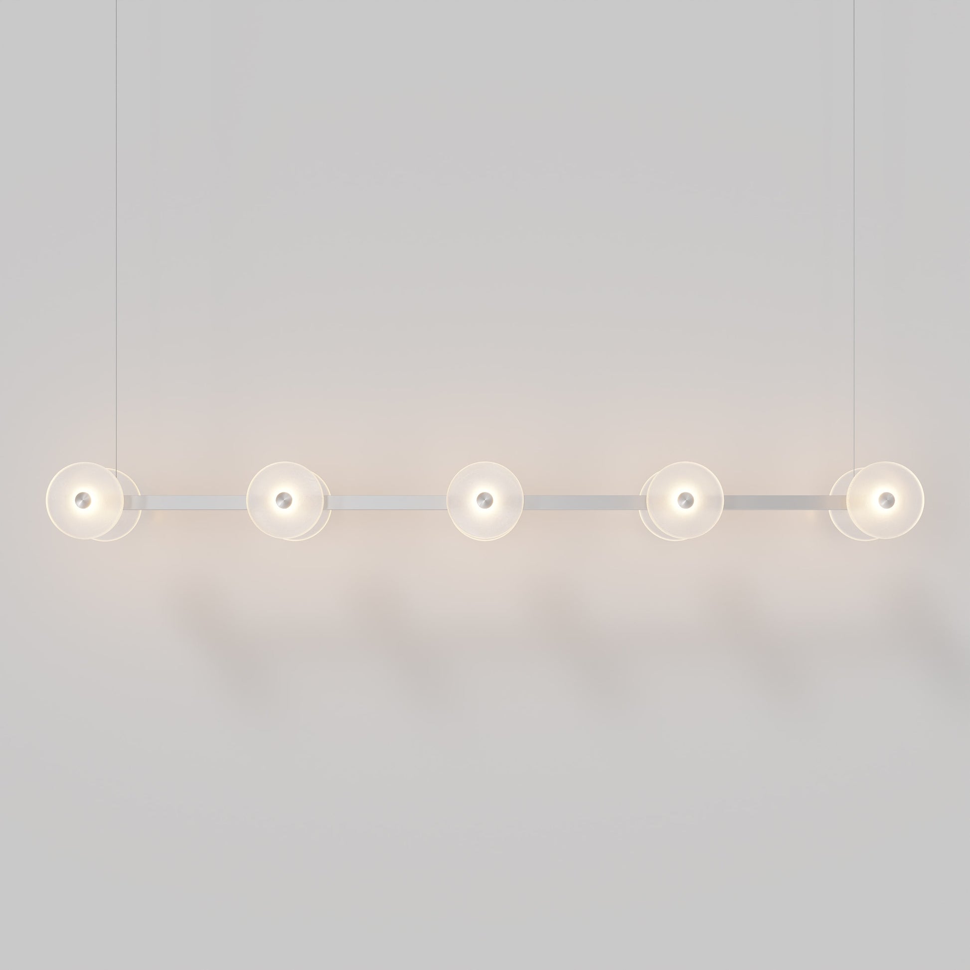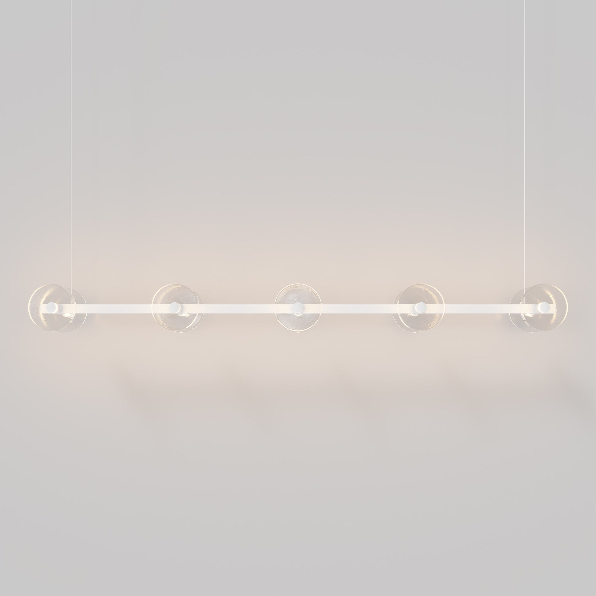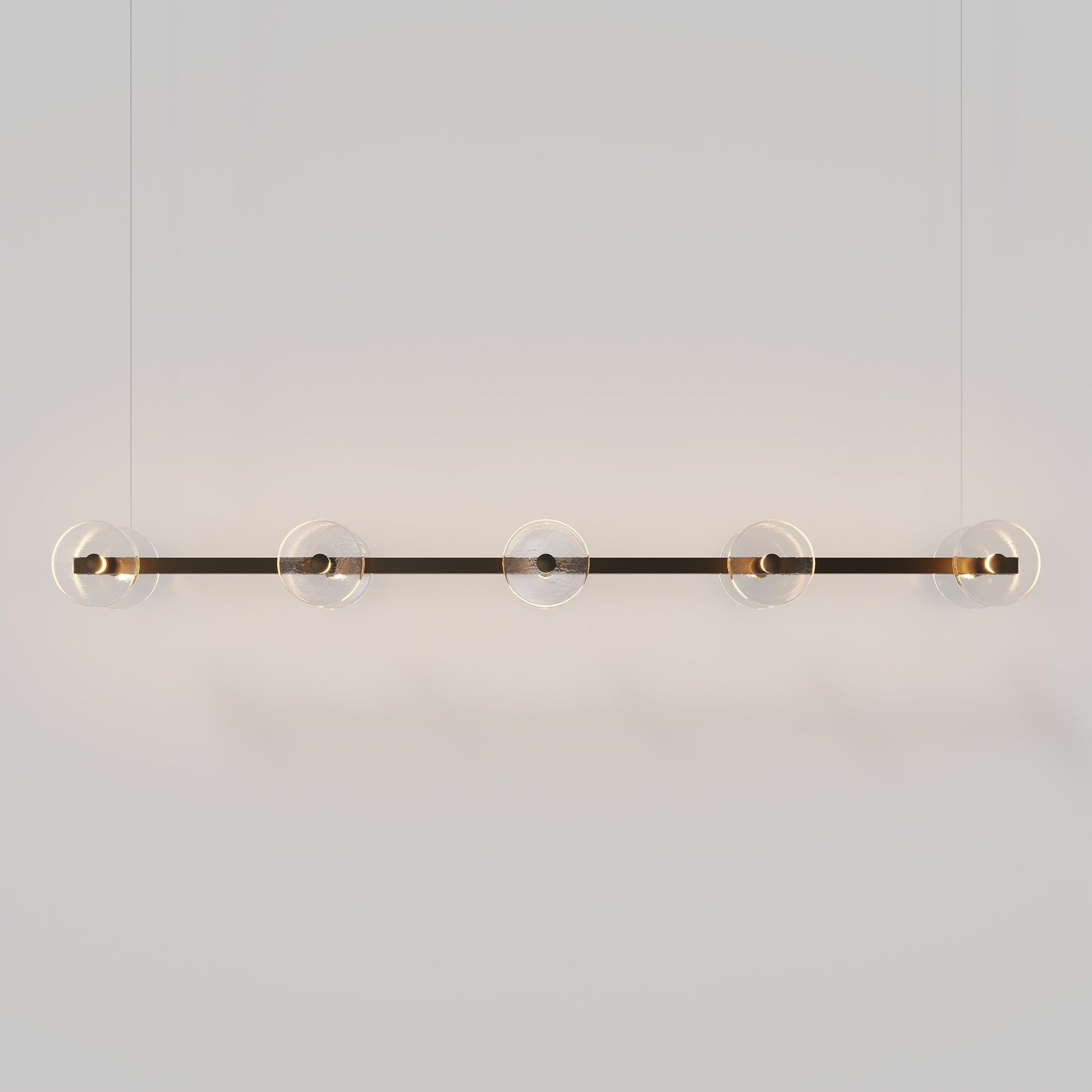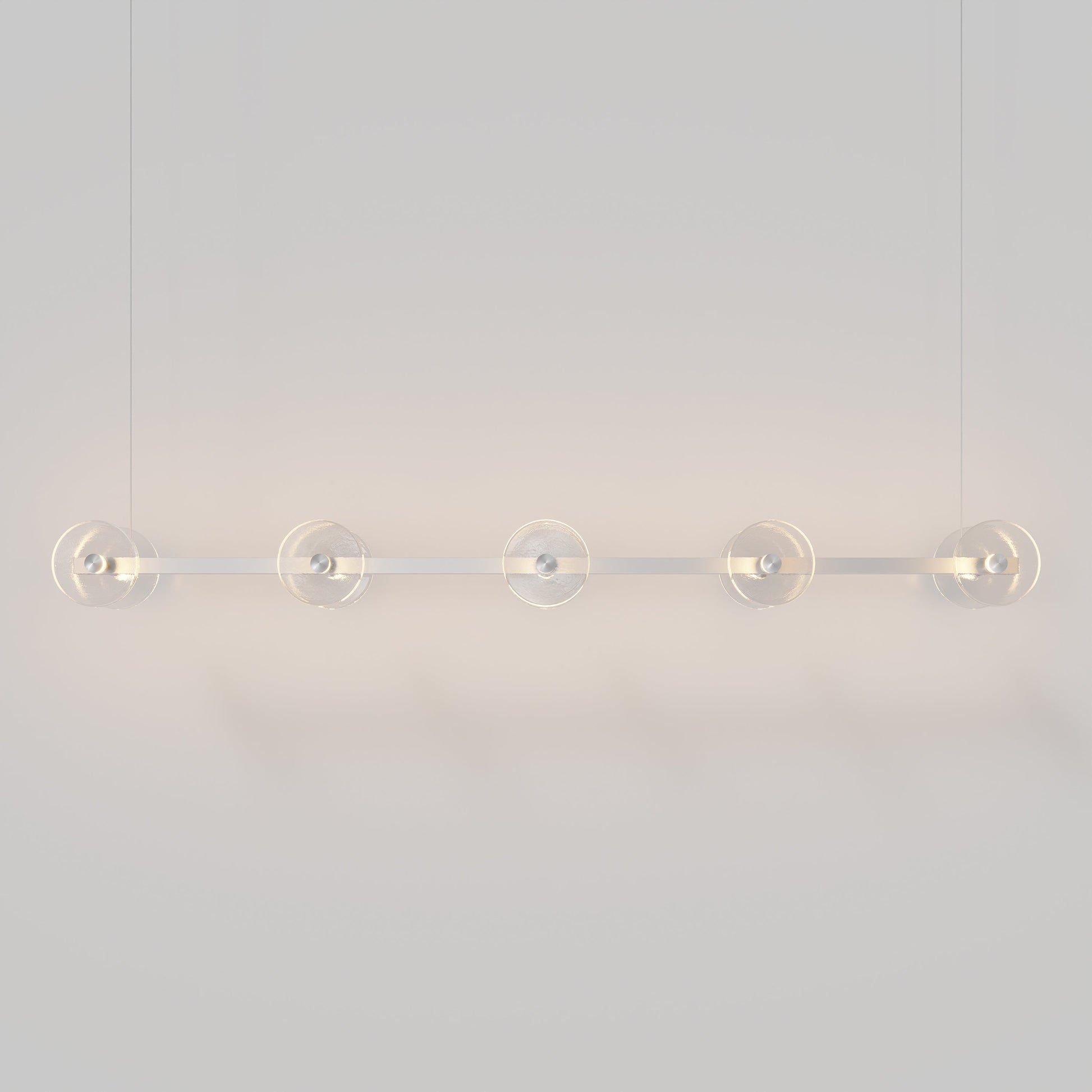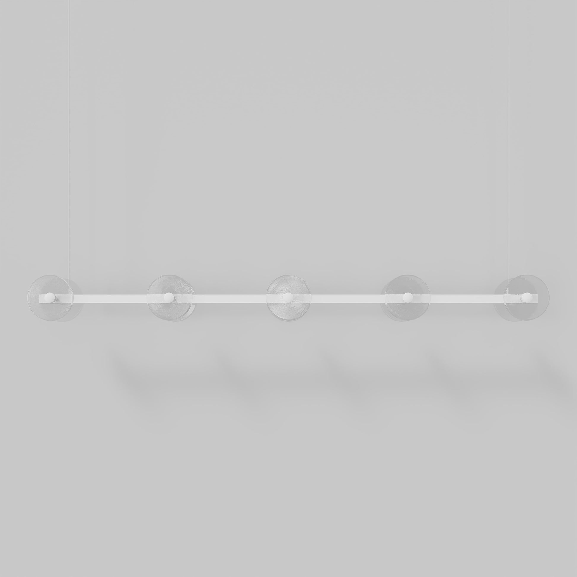 Add a feature piece to your space with the Coral Linear Bar pendant light, a beautiful modern centrepiece perfect for dining tables, kitchen islands and elegant office spaces. Featuring ten unique glass-blown discs suspended on a rod available in a selection of finishes including brass finish, steel finish, matte black, matte white, or medium bronze powder coating. Choose from a frosted or clear finish and set the mood of your space with a choice of warm, warm white, or white LED temperatures. Meticulously hand-blown using premium Swedish clear glass, each disc carries the distinctiveness of SOKTAS Glass designs, promising an unparalleled and personalised lighting masterpiece that adds both elegance and character to your space.
