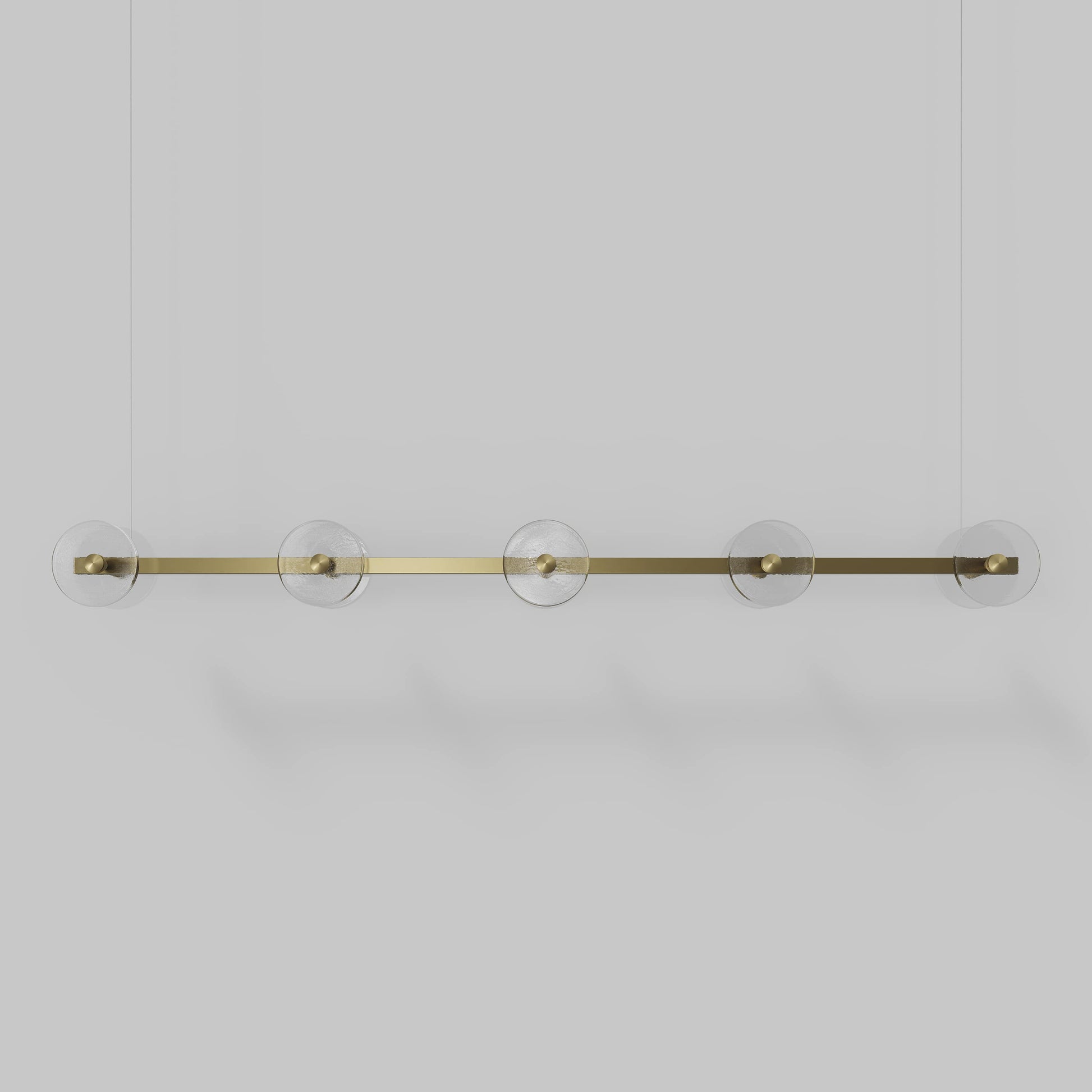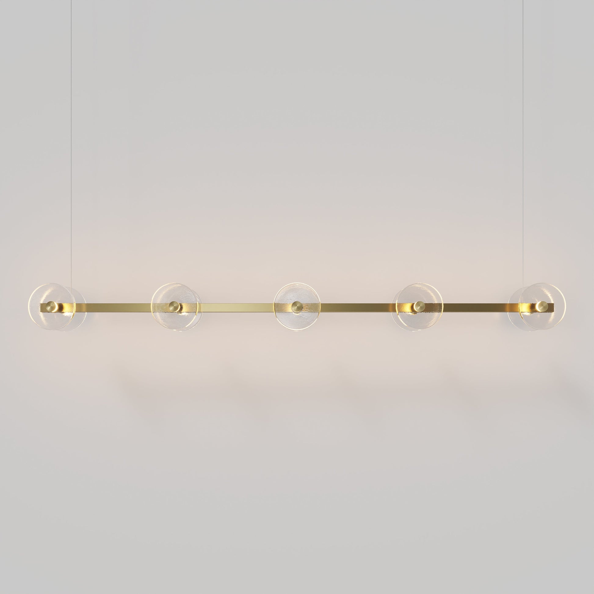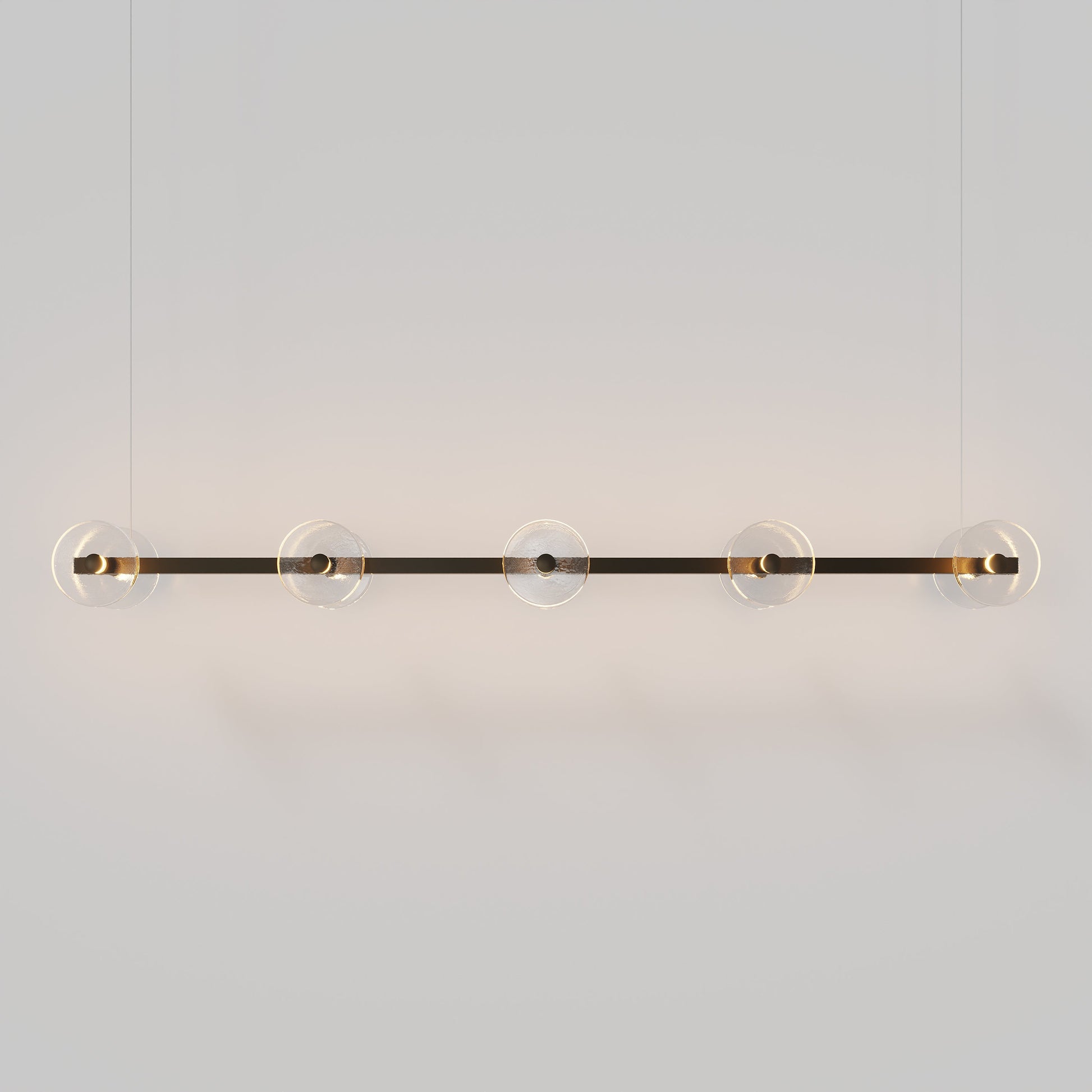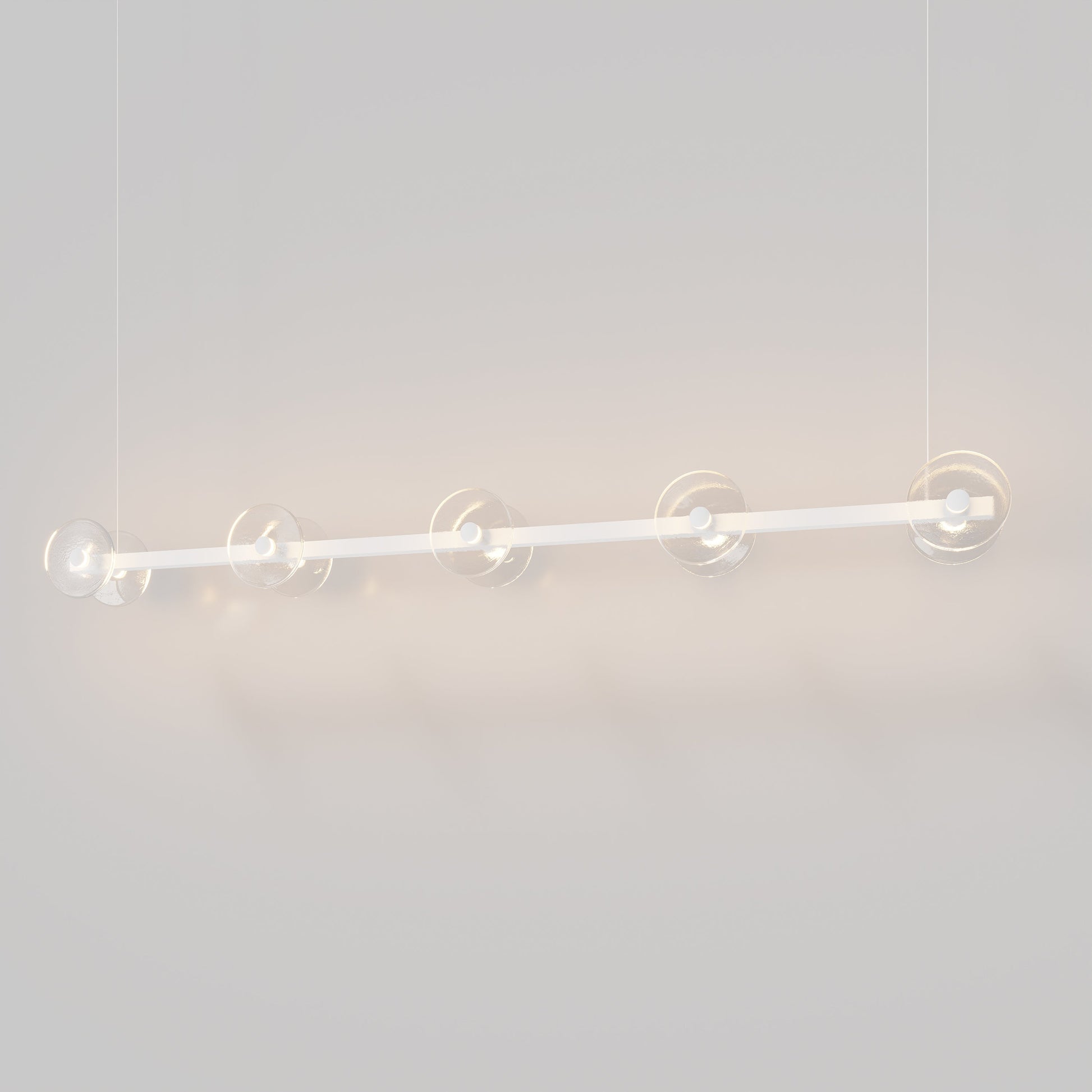 Add a feature piece to your space with the Coral Linear Bar pendant light, a beautiful modern centrepiece perfect for dining tables, kitchen islands and elegant office spaces. Featuring ten unique glass-blown discs suspended on a rod available in a selection of finishes including brass finish, steel finish, matte black, matte white, or medium bronze powder coating. Choose from a frosted or clear finish and set the mood of your space with a choice of warm, warm white, or white LED temperatures. Meticulously hand-blown using premium Swedish clear glass, each disc carries the distinctiveness of SOKTAS Glass designs, promising an unparalleled and personalised lighting masterpiece that adds both elegance and character to your space.