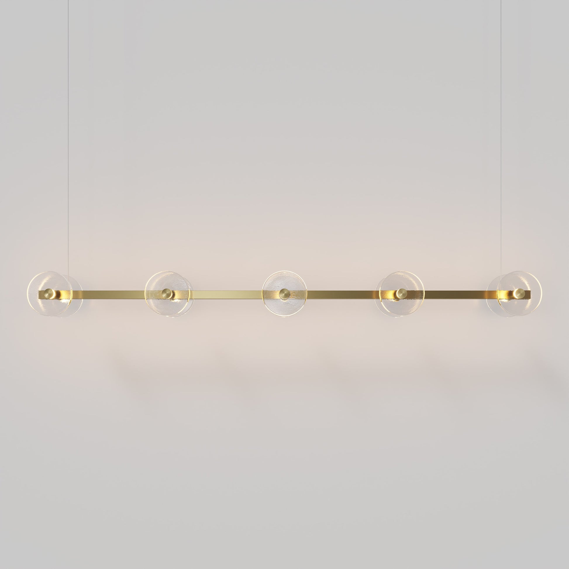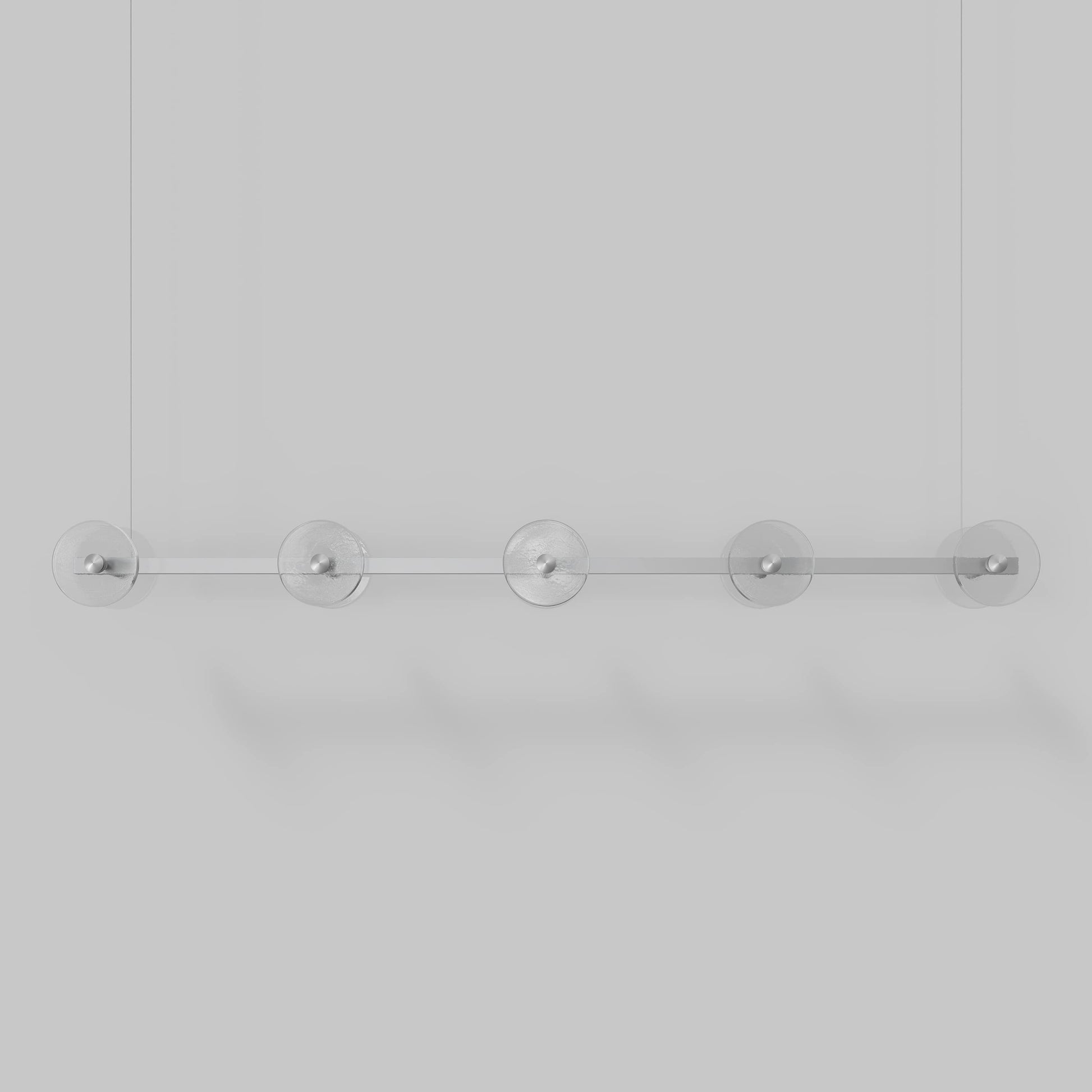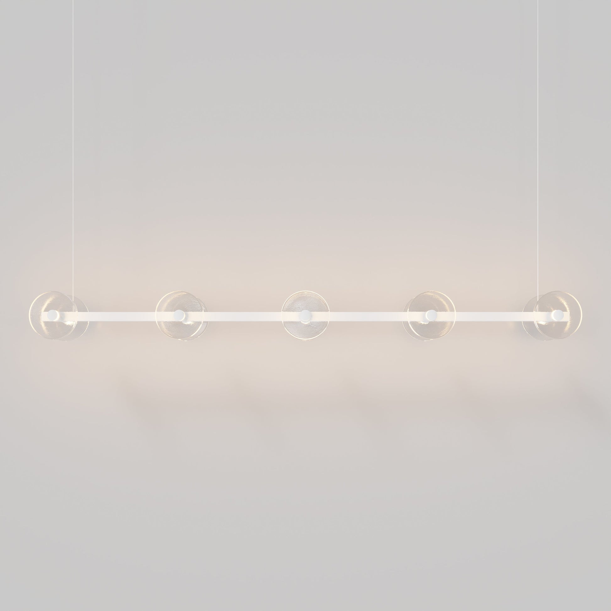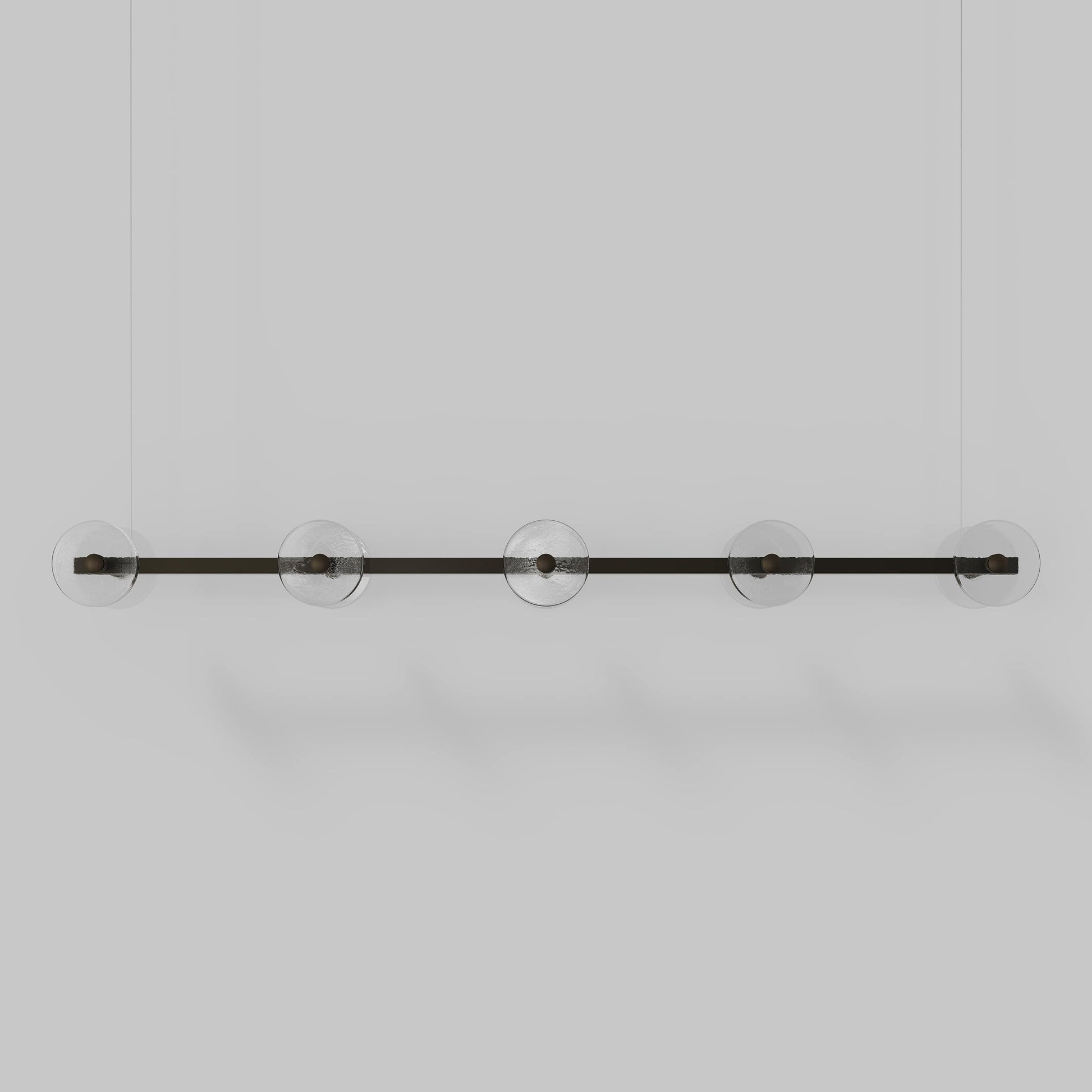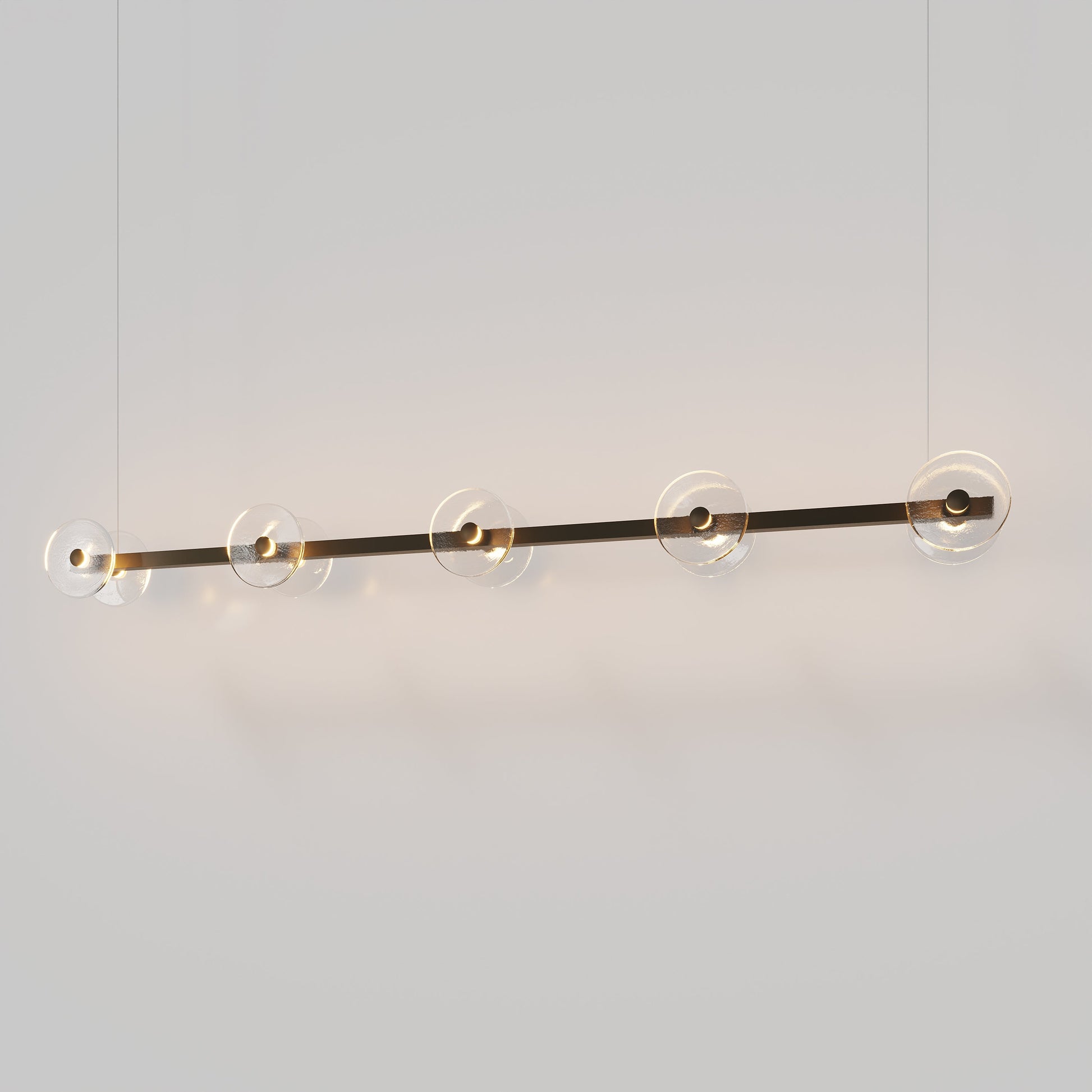 Add a feature piece to your space with the Coral Linear Bar pendant light, a beautiful modern centrepiece perfect for dining tables, kitchen islands and elegant office spaces. Featuring ten unique glass-blown discs suspended on a rod available in a selection of finishes including brass finish, steel finish, matte black, matte white, or medium bronze powder coating. Choose from a frosted or clear finish and set the mood of your space with a choice of warm, warm white, or white LED temperatures. Meticulously hand-blown using premium Swedish clear glass, each disc carries the distinctiveness of SOKTAS Glass designs, promising an unparalleled and personalised lighting masterpiece that adds both elegance and character to your space.