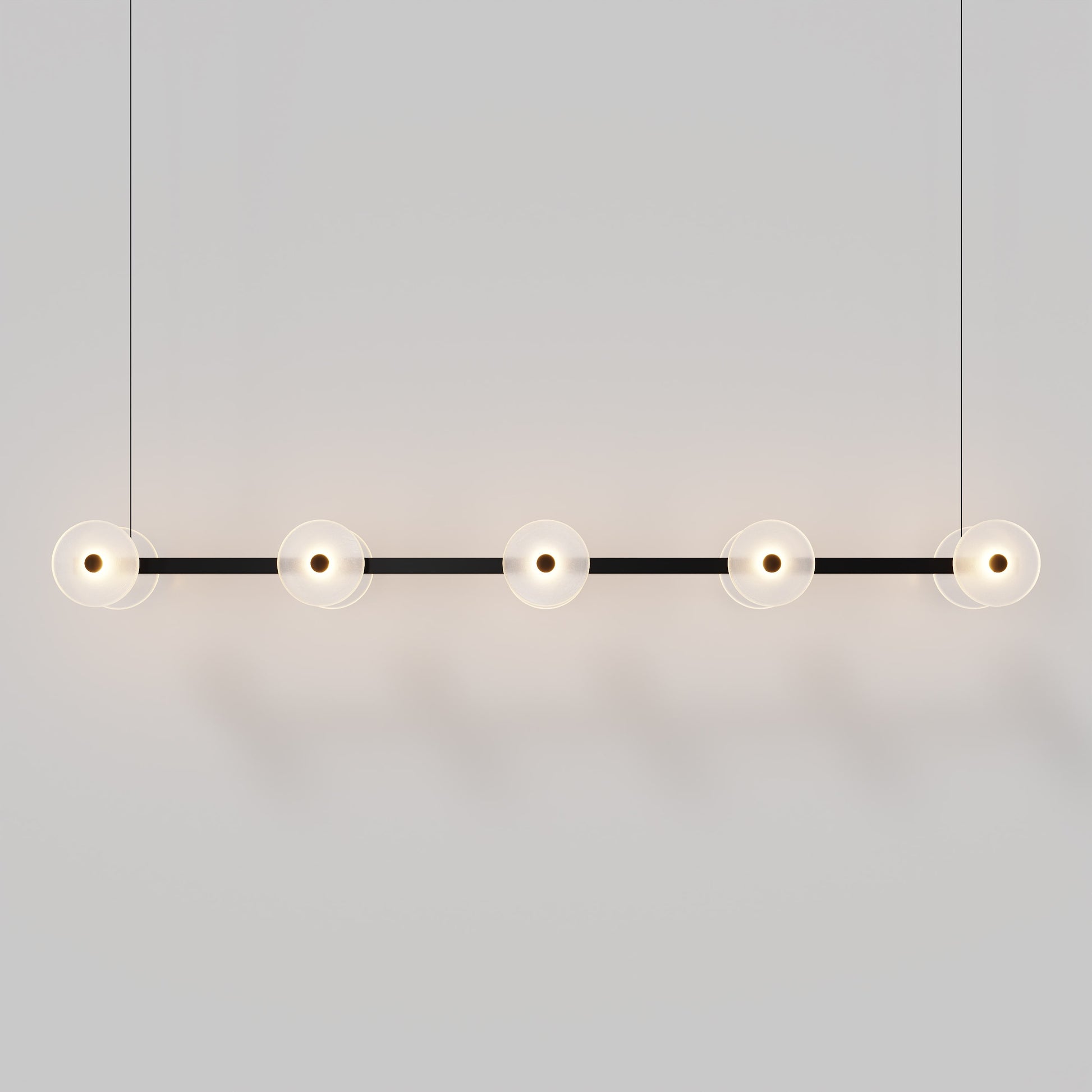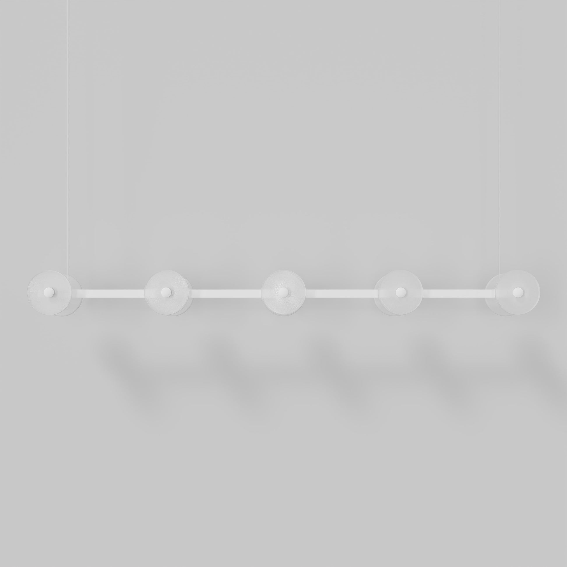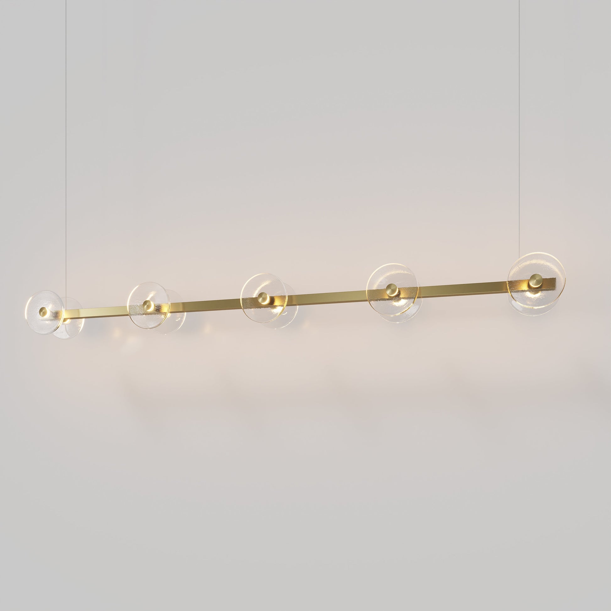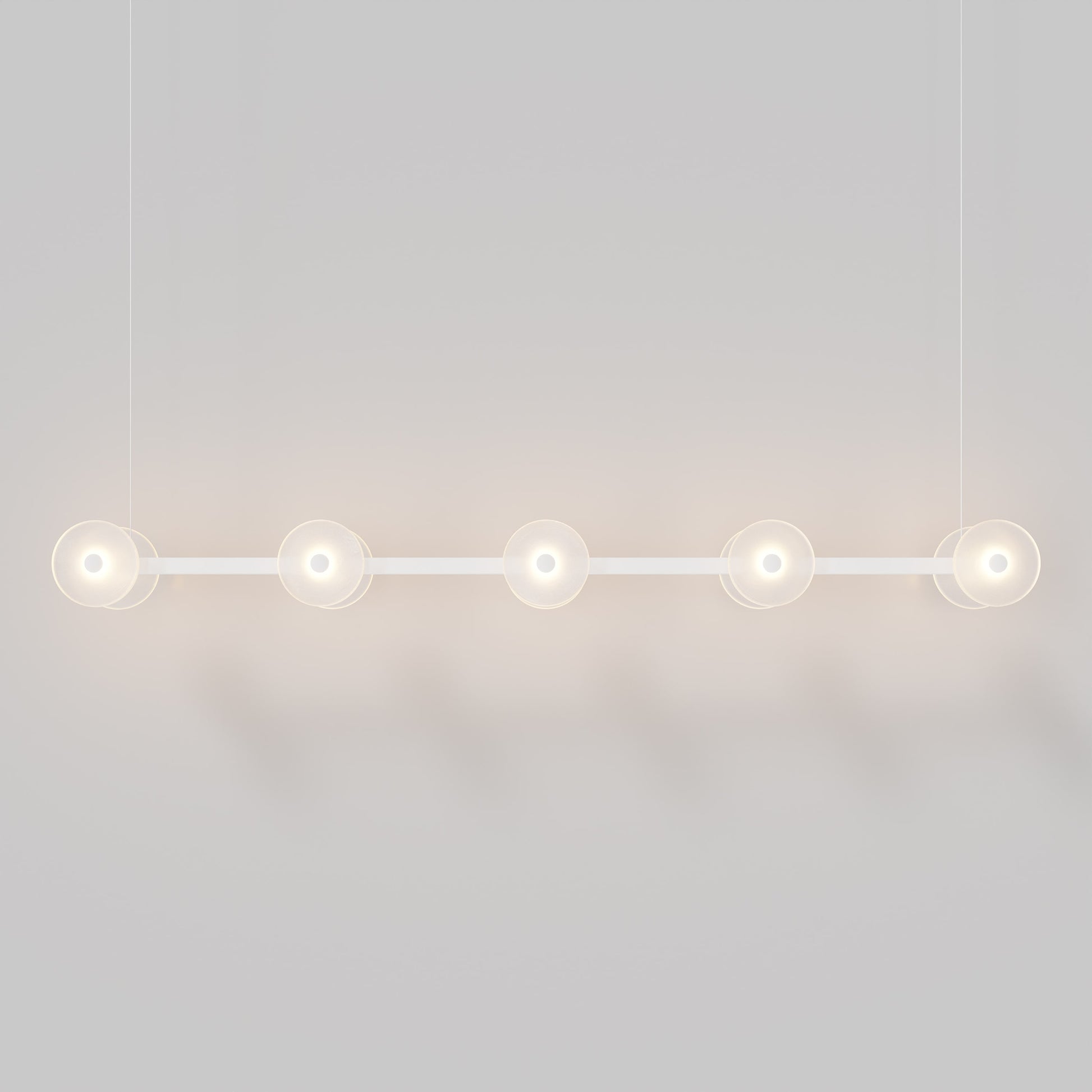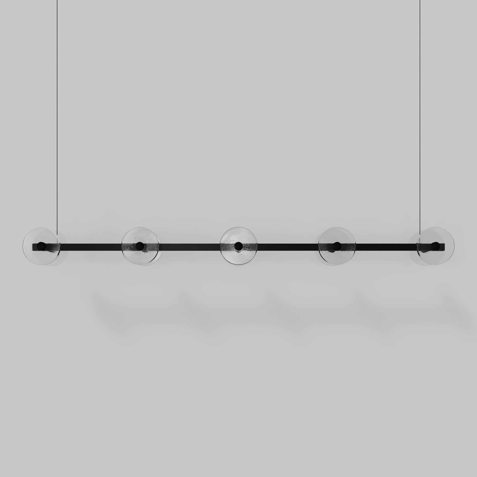 Add a feature piece to your space with the Coral Linear Bar pendant light, a beautiful modern centrepiece perfect for dining tables, kitchen islands and elegant office spaces. Featuring ten unique glass-blown discs suspended on a rod available in a selection of finishes including brass finish, steel finish, matte black, matte white, or medium bronze powder coating. Choose from a frosted or clear finish and set the mood of your space with a choice of warm, warm white, or white LED temperatures. Meticulously hand-blown using premium Swedish clear glass, each disc carries the distinctiveness of SOKTAS Glass designs, promising an unparalleled and personalised lighting masterpiece that adds both elegance and character to your space.