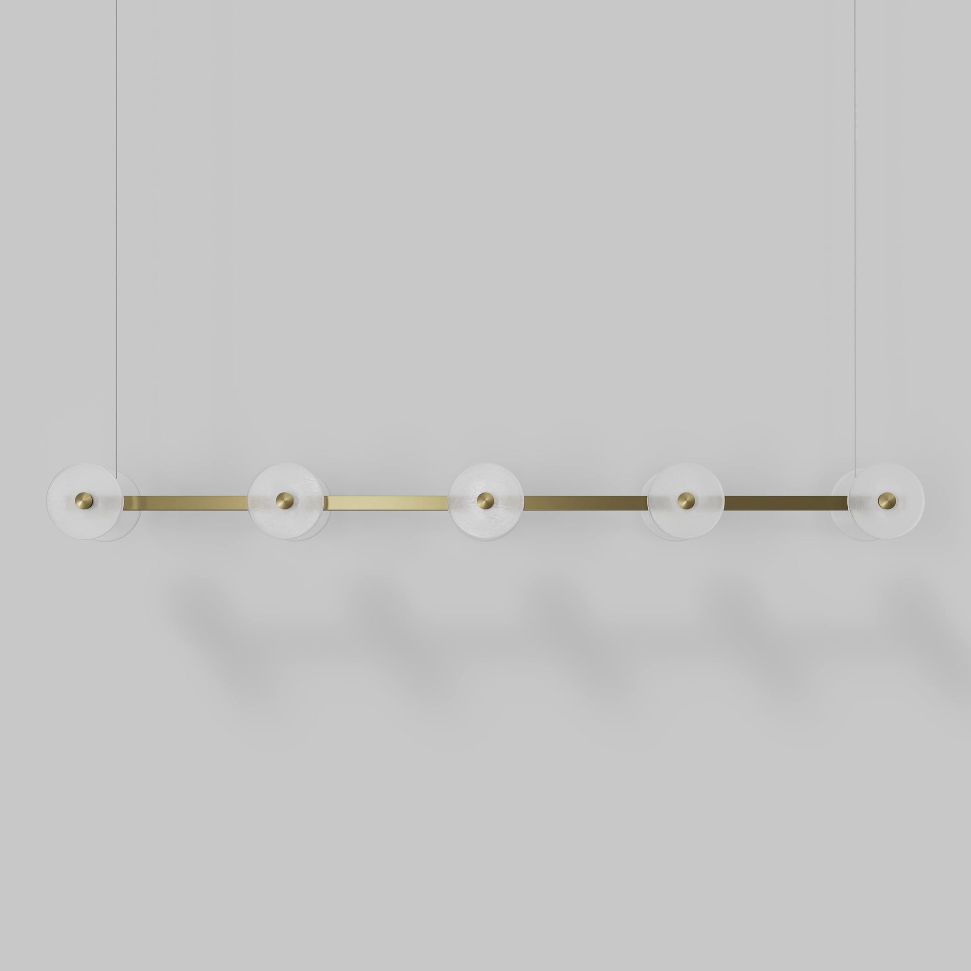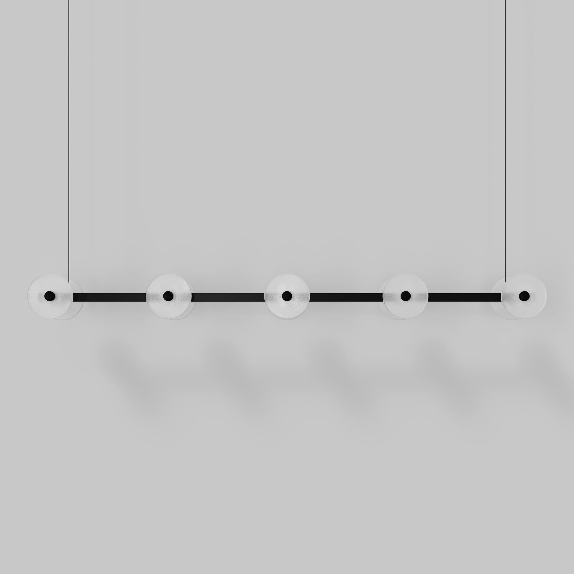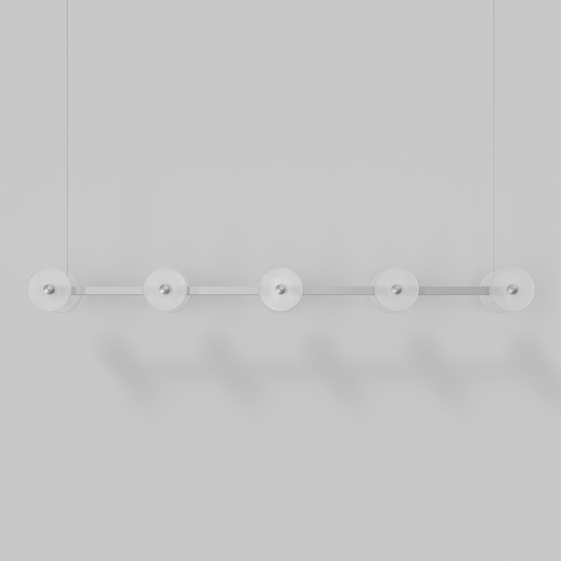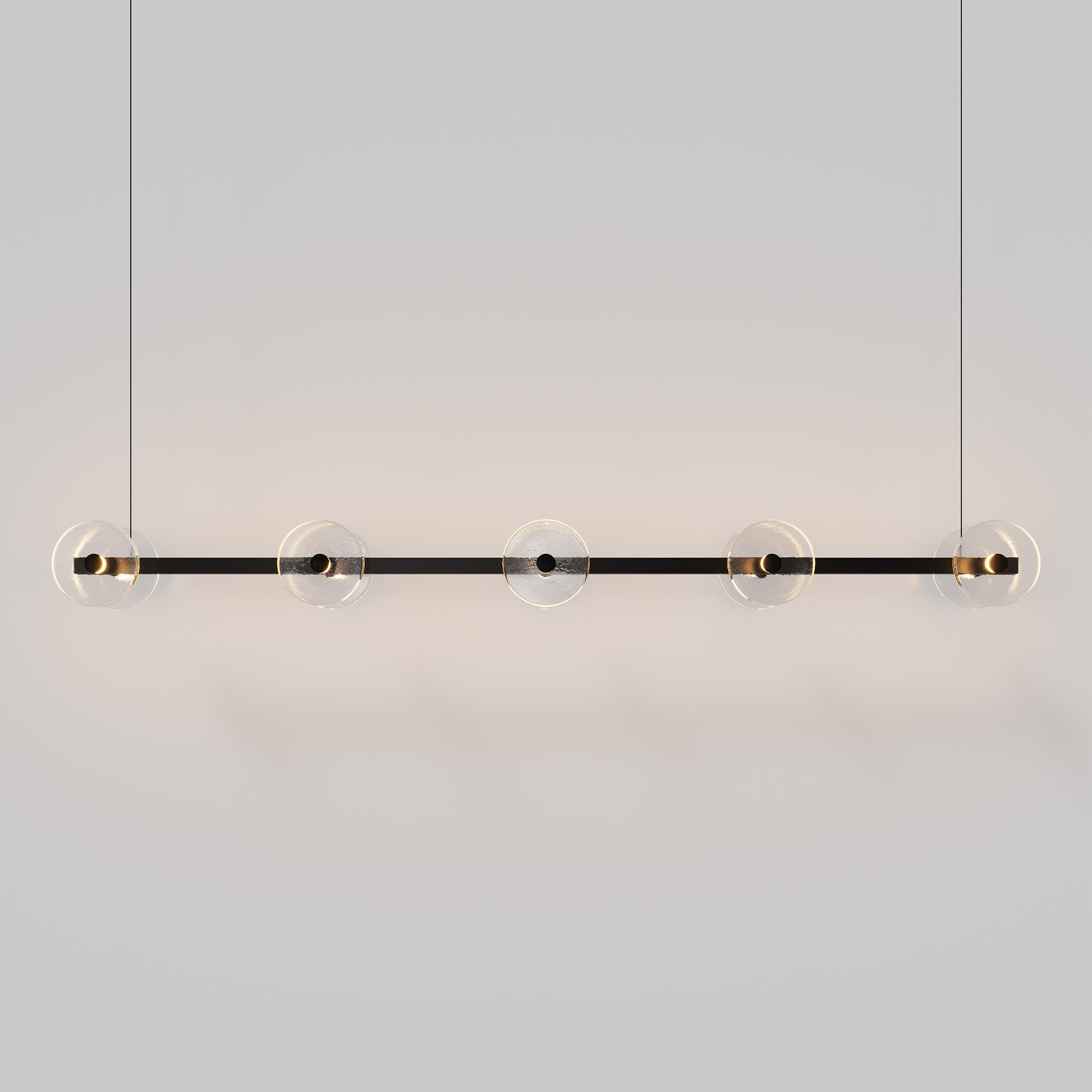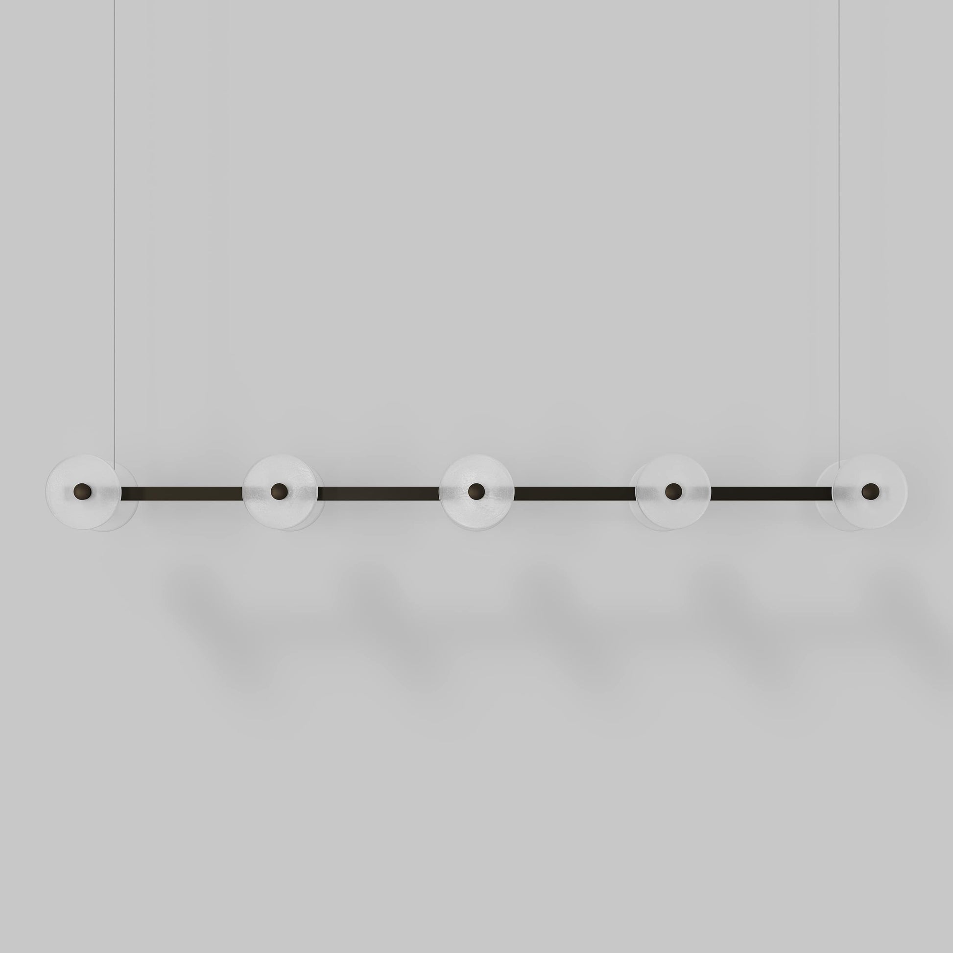 Add a feature piece to your space with the Coral Linear Bar pendant light, a beautiful modern centrepiece perfect for dining tables, kitchen islands and elegant office spaces. Featuring ten unique glass-blown discs suspended on a rod available in a selection of finishes including brass finish, steel finish, matte black, matte white, or medium bronze powder coating. Choose from a frosted or clear finish and set the mood of your space with a choice of warm, warm white, or white LED temperatures. Meticulously hand-blown using premium Swedish clear glass, each disc carries the distinctiveness of SOKTAS Glass designs, promising an unparalleled and personalised lighting masterpiece that adds both elegance and character to your space.