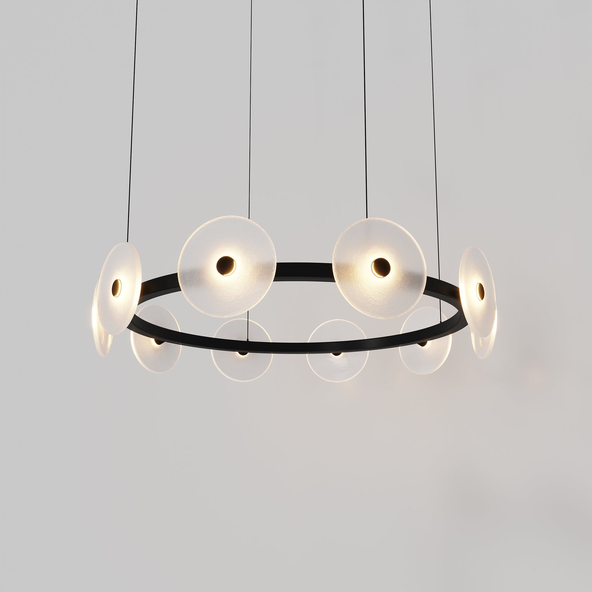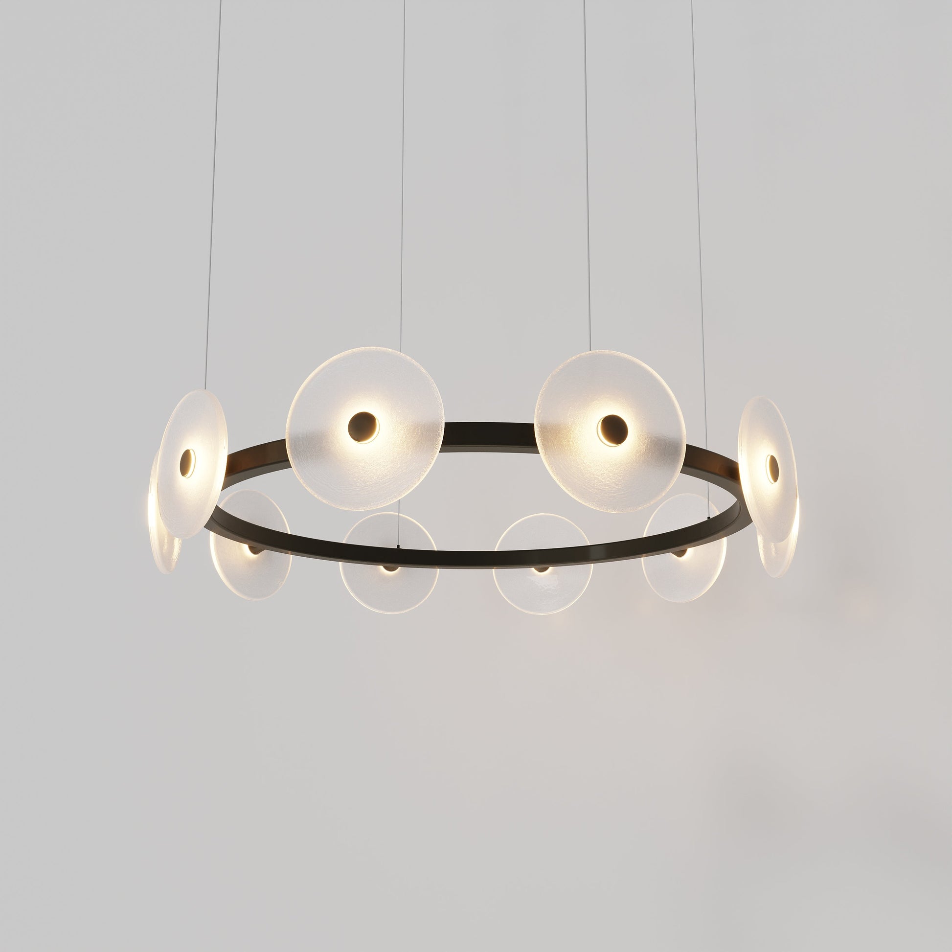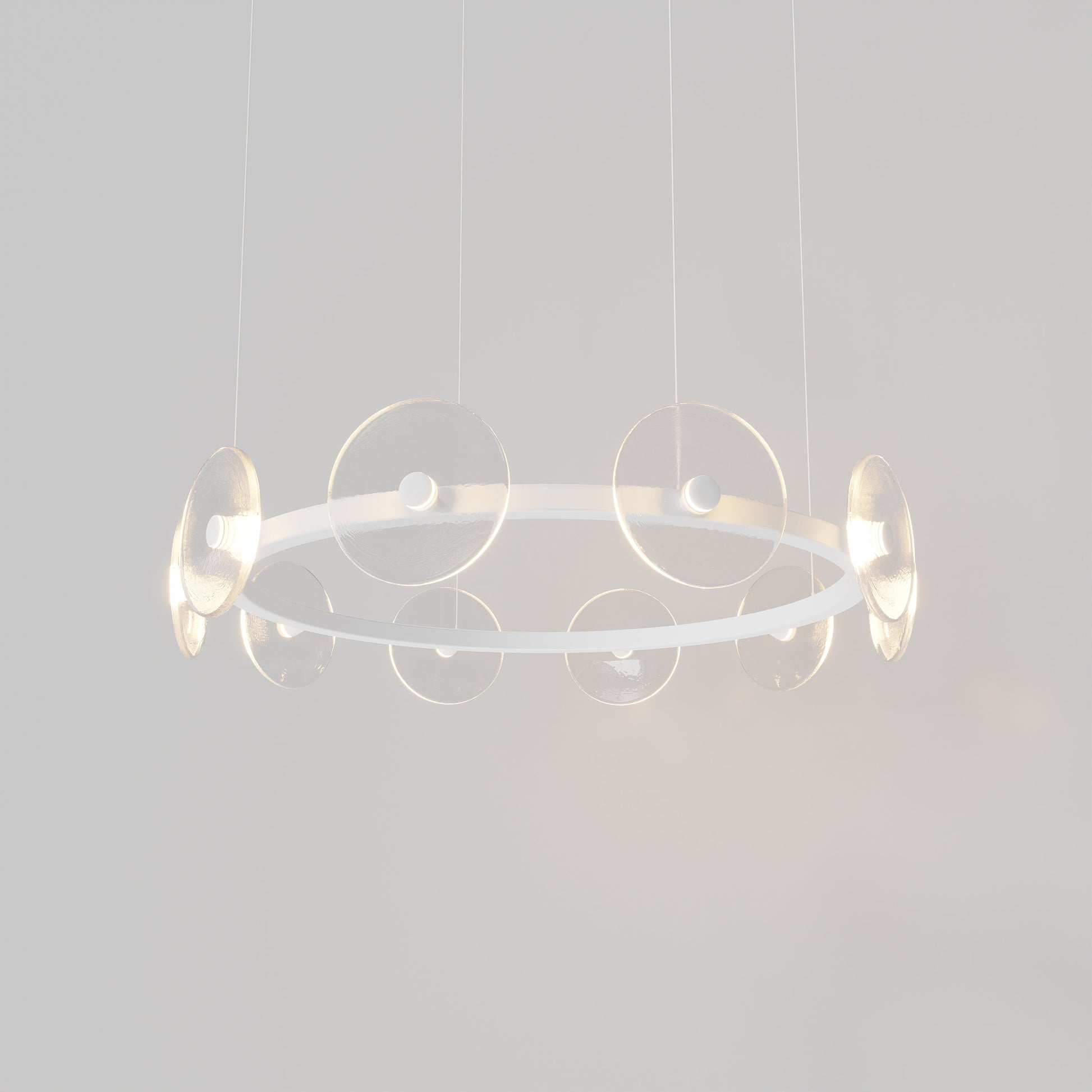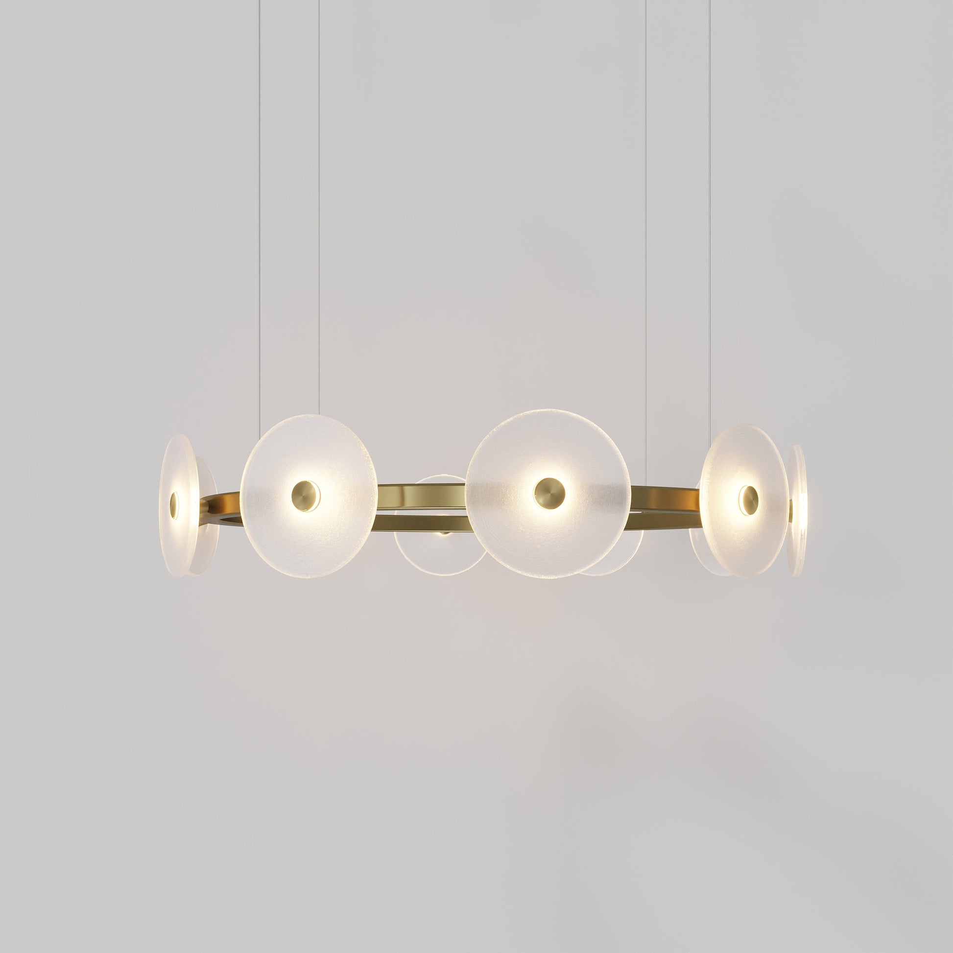 Adorn your space with the remarkable Coral Ring 10 pendant light. The circular ring base, available in a brass finish, matte black, matte white, and medium bronze finishes provides a striking canvas for the arrangement of ten individual hand-blown glass discs. This ring of modern art adds a distinctive touch of opulence to any space, particularly suited for hanging above dining tables, kitchen islands, or within an office space. Choose from a frosted or clear finish and set the mood of your space with a choice of warm, warm white, or white LED temperatures. Meticulously hand-blown using premium Swedish clear glass, each disc carries the distinctiveness of SOKTAS Glass designs, promising an unparalleled and personalised lighting masterpiece that adds both elegance and character to your space.
