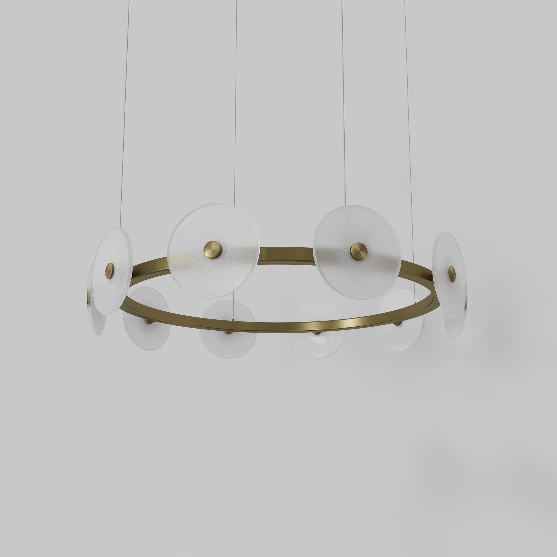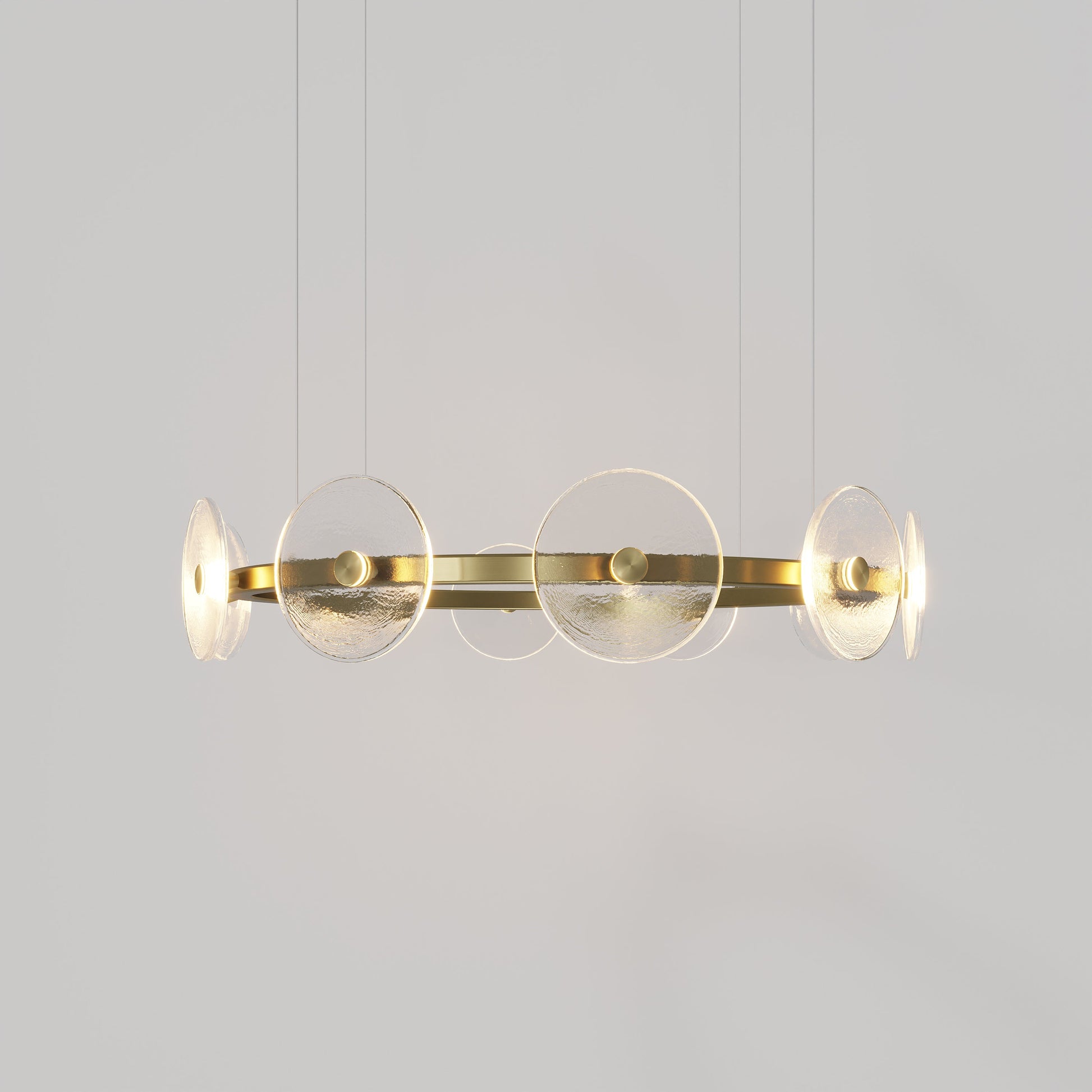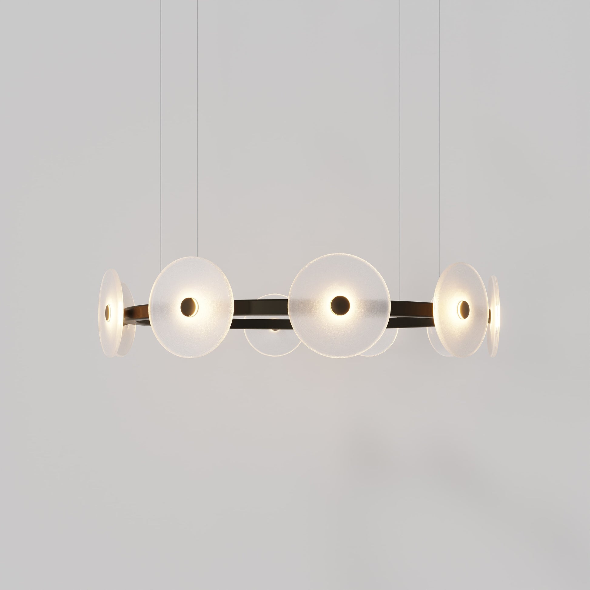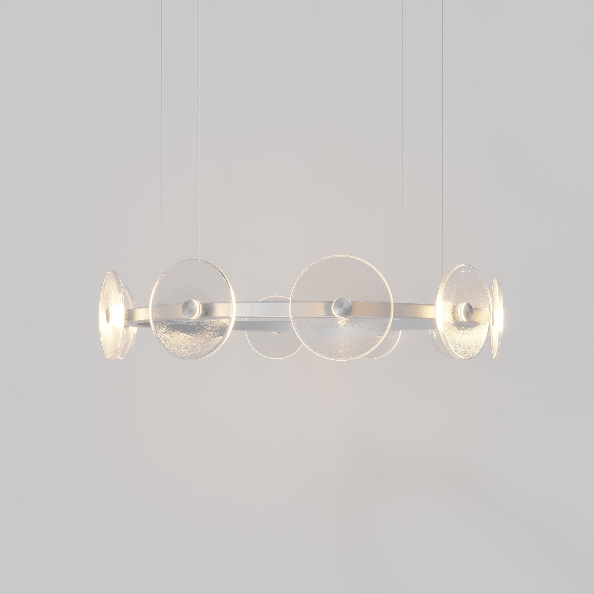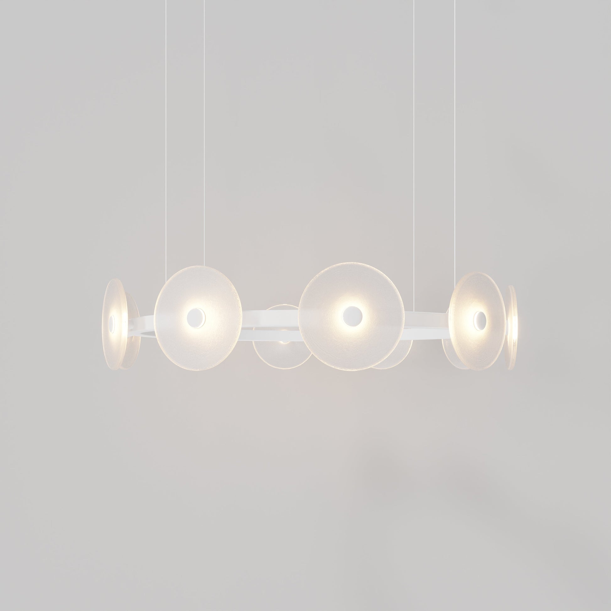 Adorn your space with the remarkable Coral Ring 10 pendant light. The circular ring base, available in a brass finish, matte black, matte white, and medium bronze finishes provides a striking canvas for the arrangement of ten individual hand-blown glass discs. This ring of modern art adds a distinctive touch of opulence to any space, particularly suited for hanging above dining tables, kitchen islands, or within an office space. Choose from a frosted or clear finish and set the mood of your space with a choice of warm, warm white, or white LED temperatures. Meticulously hand-blown using premium Swedish clear glass, each disc carries the distinctiveness of SOKTAS Glass designs, promising an unparalleled and personalised lighting masterpiece that adds both elegance and character to your space.