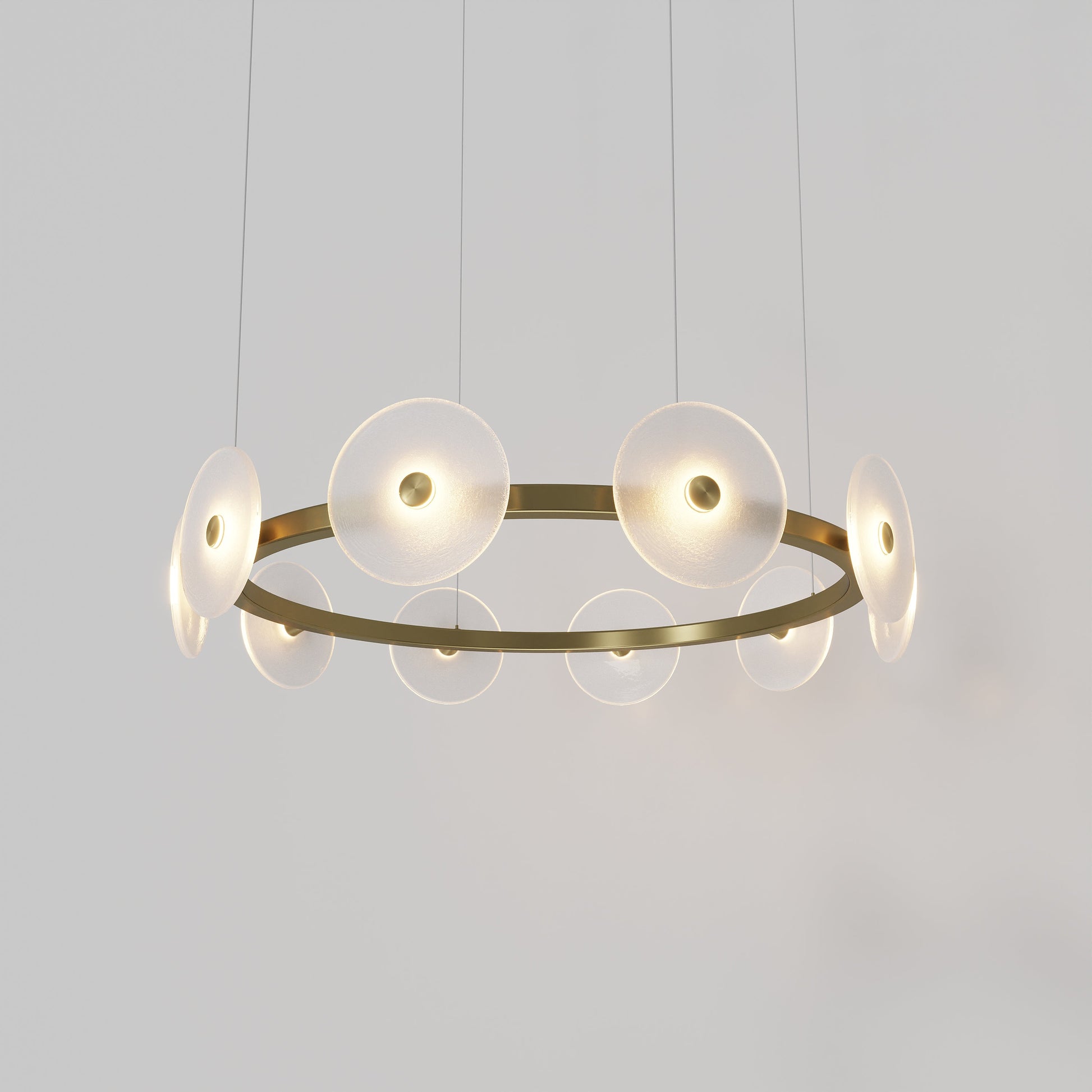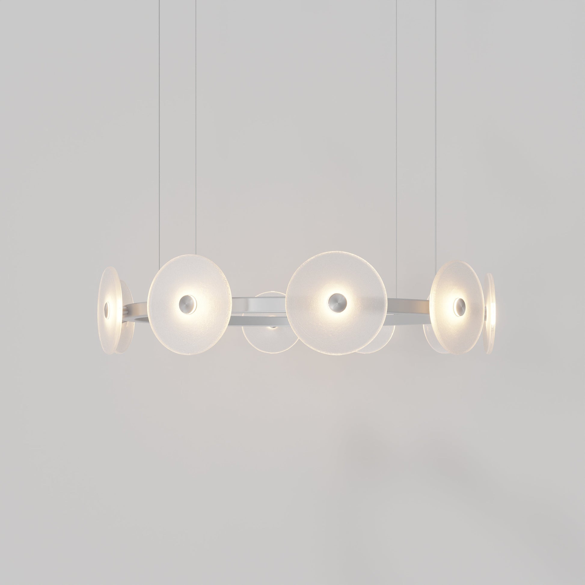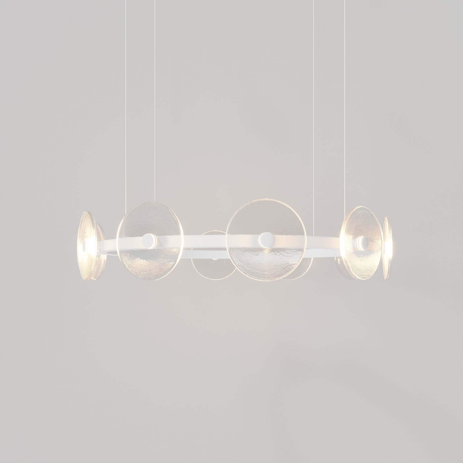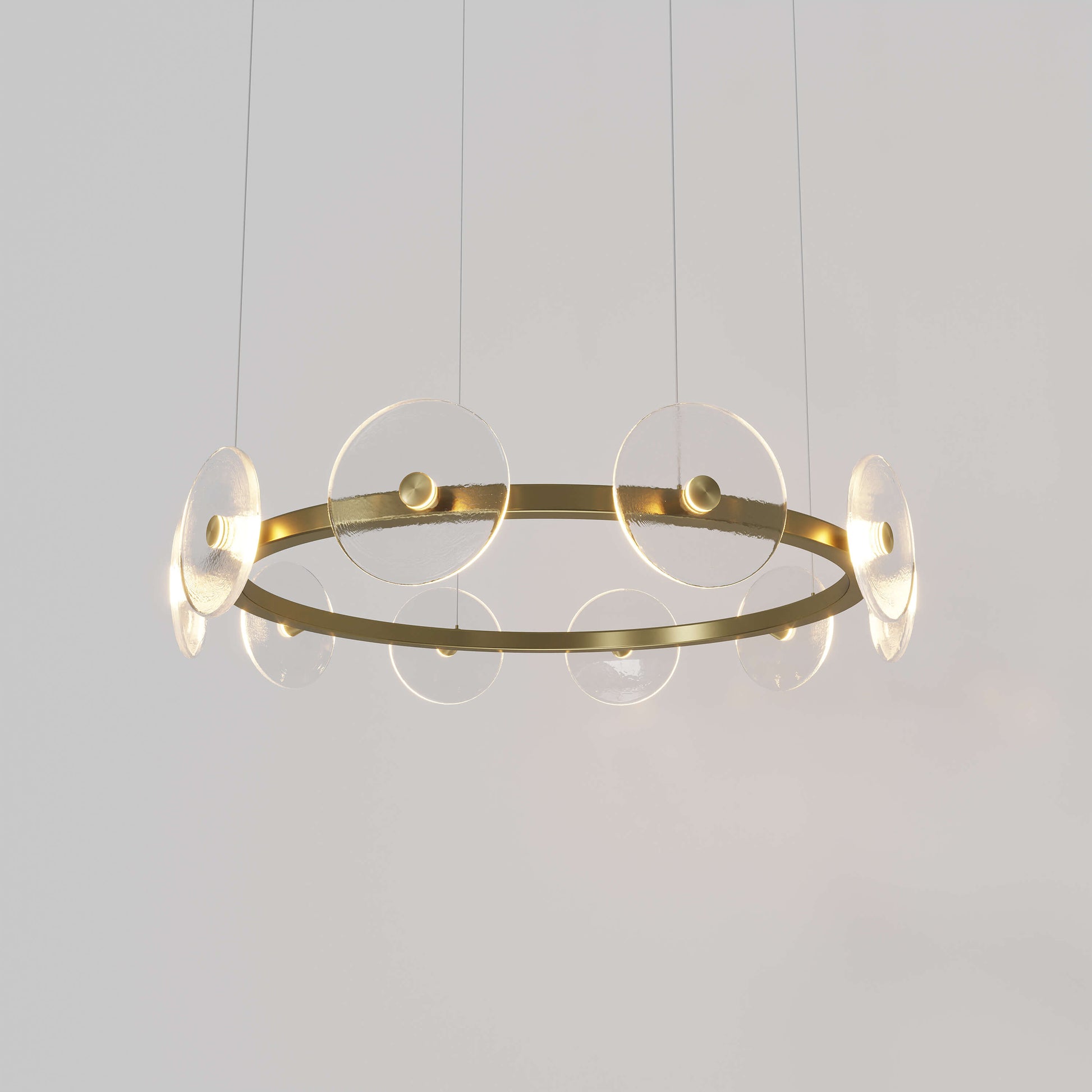 Adorn your space with the remarkable Coral Ring 10 pendant light. The circular ring base, available in a brass finish, matte black, matte white, and medium bronze finishes provides a striking canvas for the arrangement of ten individual hand-blown glass discs. This ring of modern art adds a distinctive touch of opulence to any space, particularly suited for hanging above dining tables, kitchen islands, or within an office space. Choose from a frosted or clear finish and set the mood of your space with a choice of warm, warm white, or white LED temperatures. Meticulously hand-blown using premium Swedish clear glass, each disc carries the distinctiveness of SOKTAS Glass designs, promising an unparalleled and personalised lighting masterpiece that adds both elegance and character to your space.