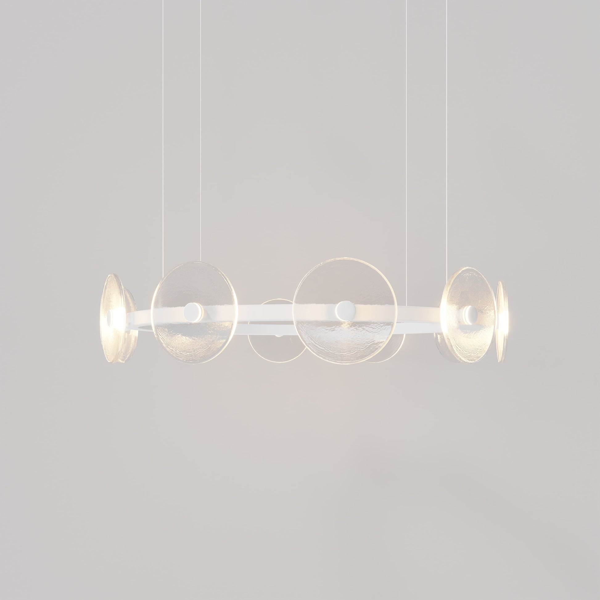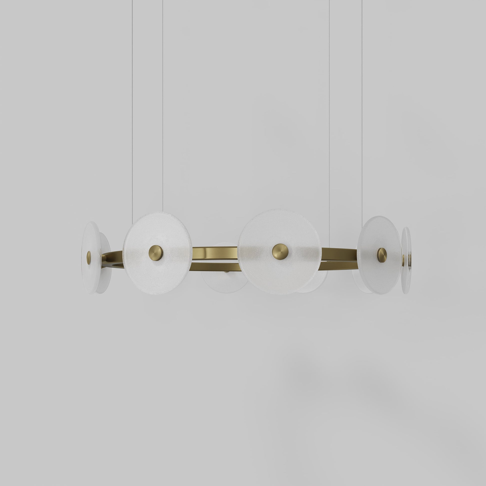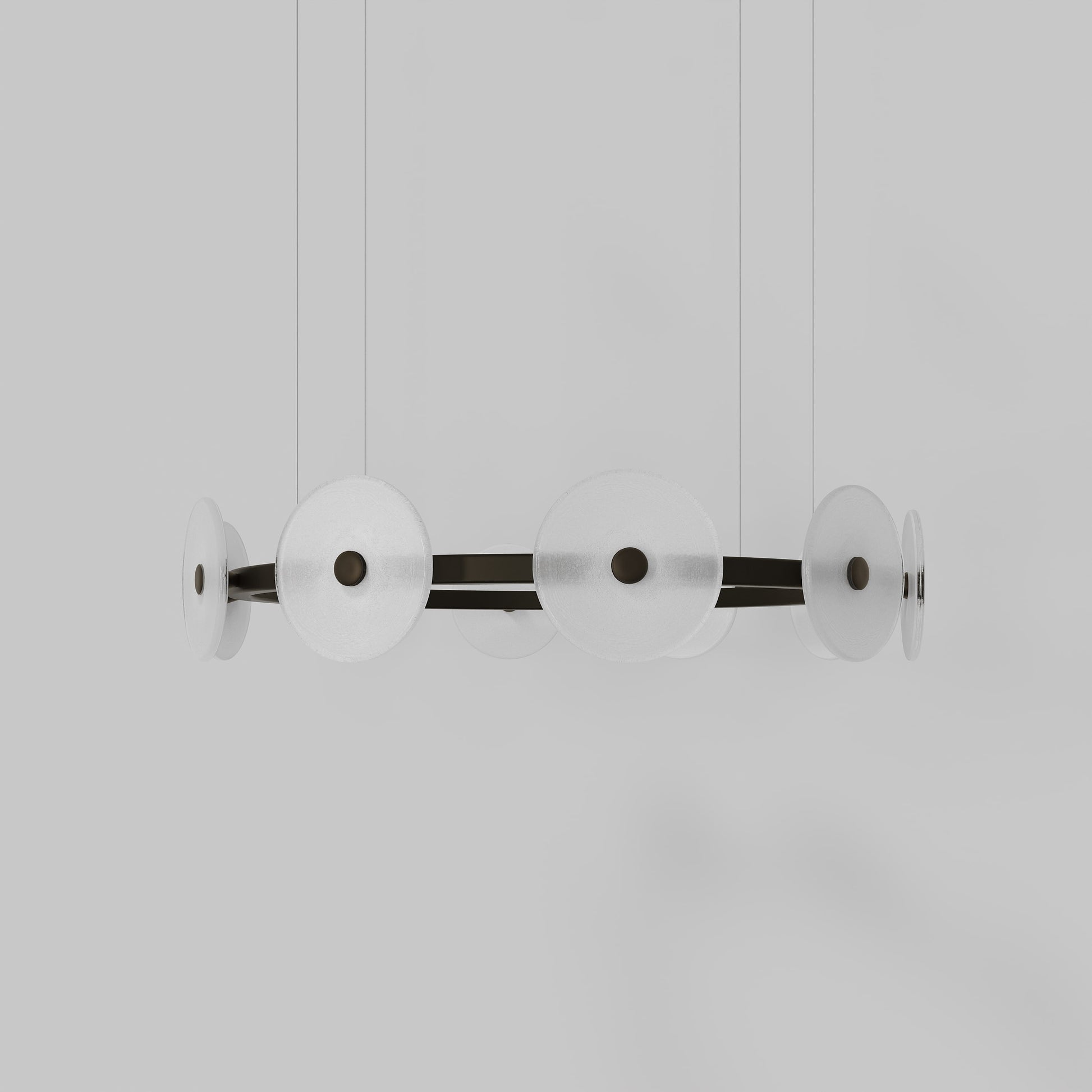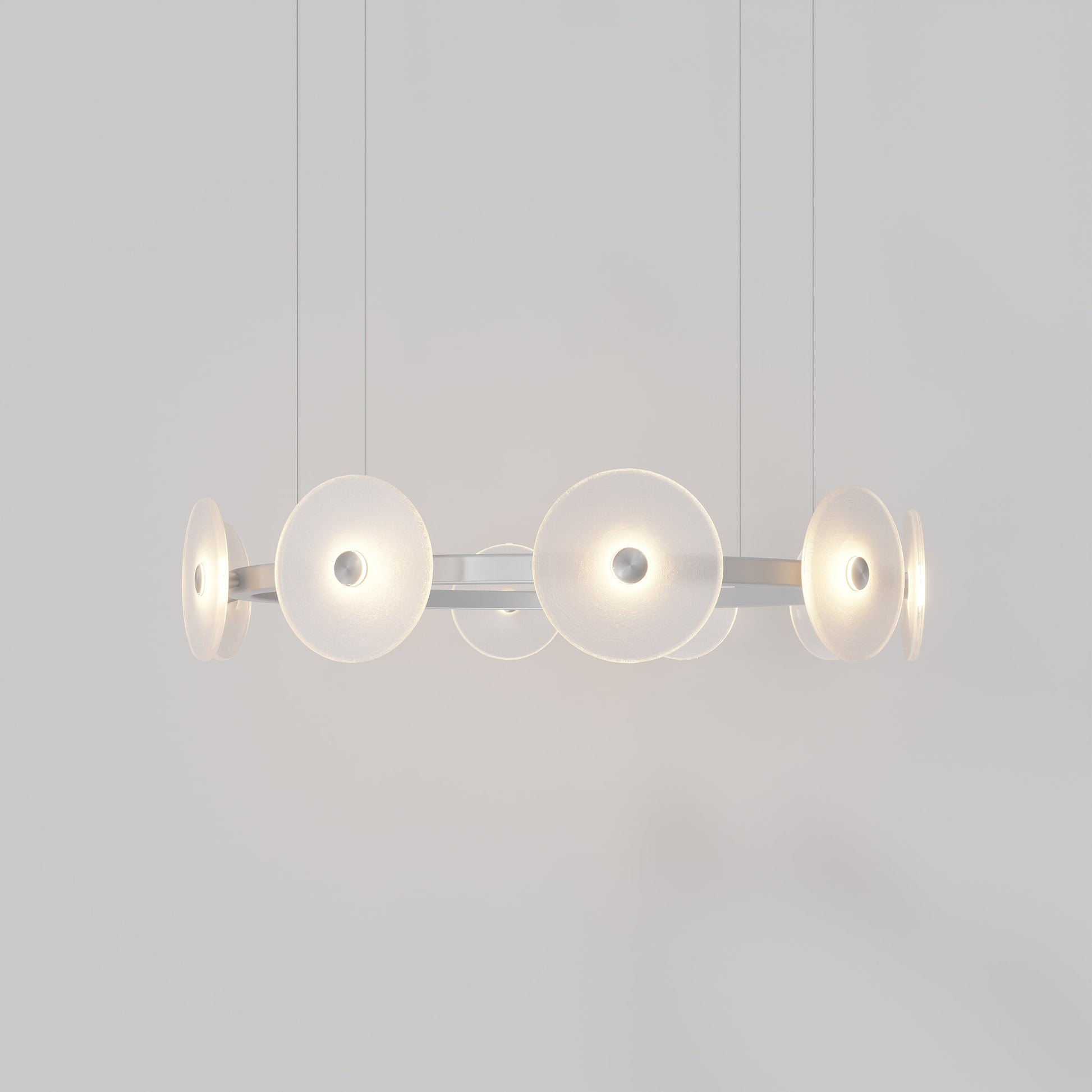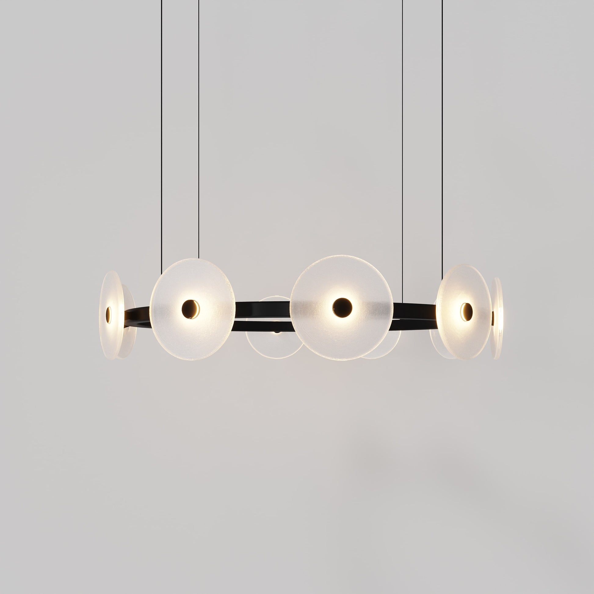 Adorn your space with the remarkable Coral Ring 10 pendant light. The circular ring base, available in a brass finish, matte black, matte white, and medium bronze finishes provides a striking canvas for the arrangement of ten individual hand-blown glass discs. This ring of modern art adds a distinctive touch of opulence to any space, particularly suited for hanging above dining tables, kitchen islands, or within an office space. Choose from a frosted or clear finish and set the mood of your space with a choice of warm, warm white, or white LED temperatures. Meticulously hand-blown using premium Swedish clear glass, each disc carries the distinctiveness of SOKTAS Glass designs, promising an unparalleled and personalised lighting masterpiece that adds both elegance and character to your space.