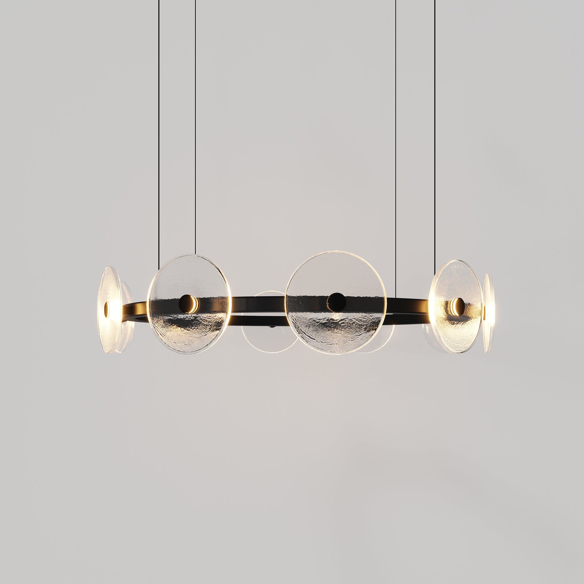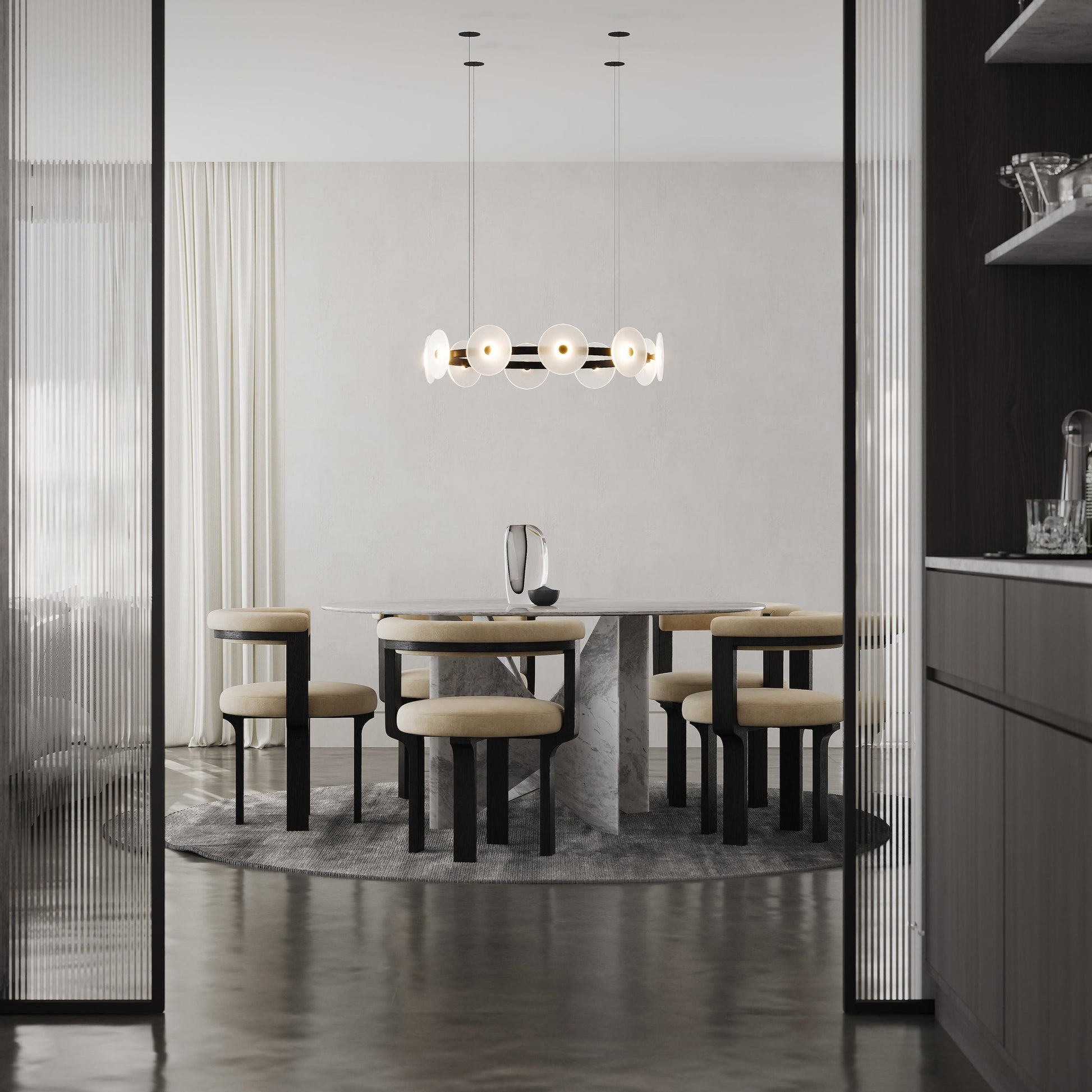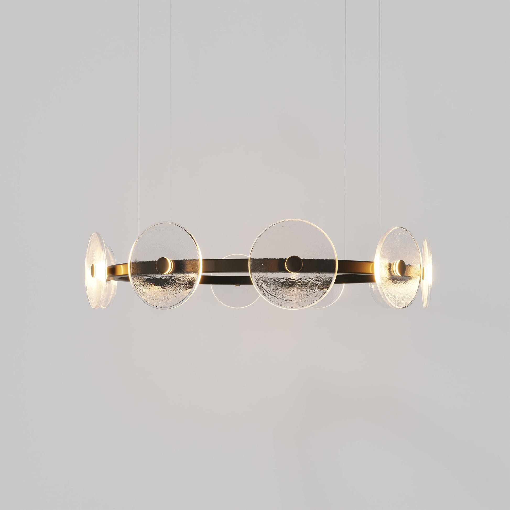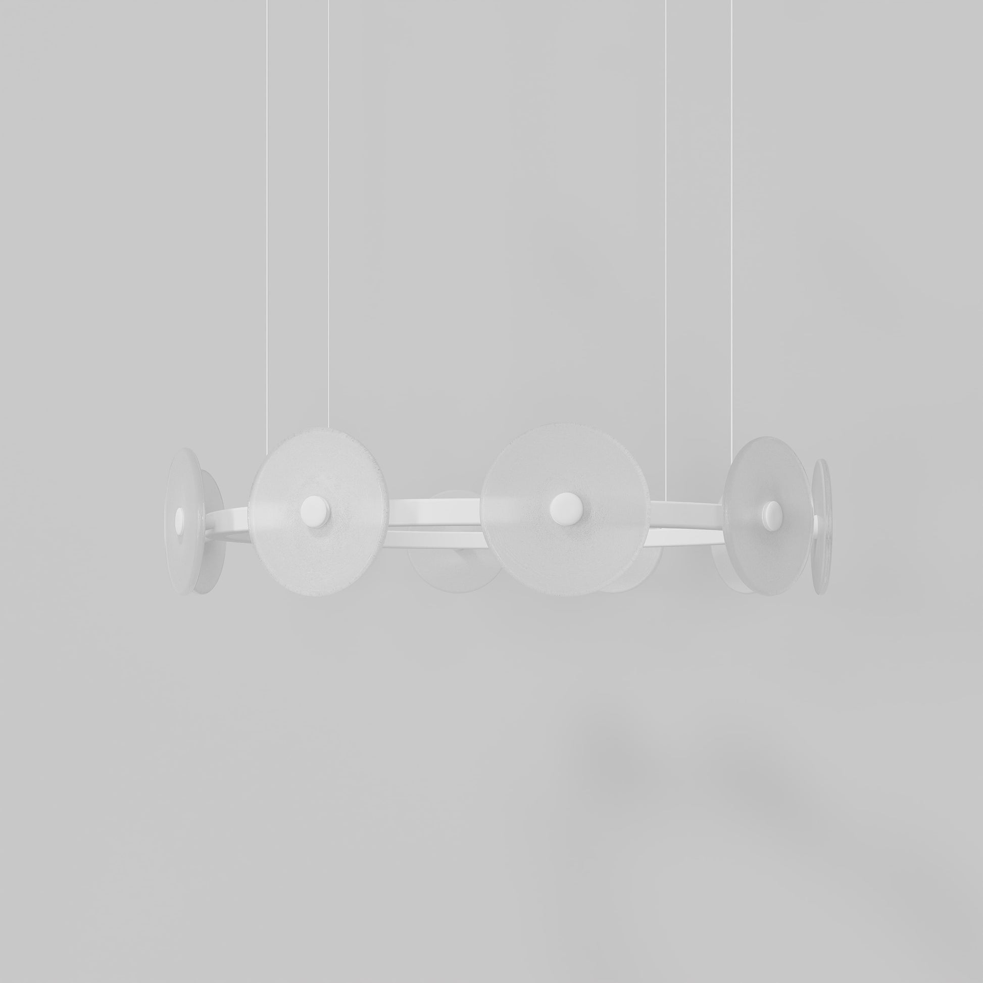 Adorn your space with the remarkable Coral Ring 10 pendant light. The circular ring base, available in a brass finish, matte black, matte white, and medium bronze finishes provides a striking canvas for the arrangement of ten individual hand-blown glass discs. This ring of modern art adds a distinctive touch of opulence to any space, particularly suited for hanging above dining tables, kitchen islands, or within an office space. Choose from a frosted or clear finish and set the mood of your space with a choice of warm, warm white, or white LED temperatures. Meticulously hand-blown using premium Swedish clear glass, each disc carries the distinctiveness of SOKTAS Glass designs, promising an unparalleled and personalised lighting masterpiece that adds both elegance and character to your space.