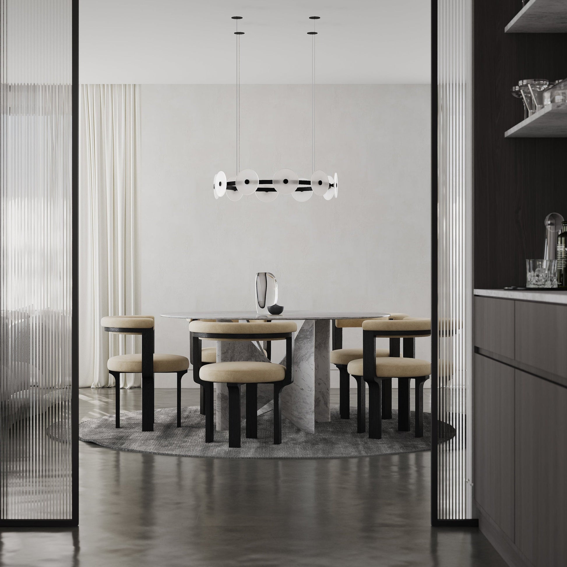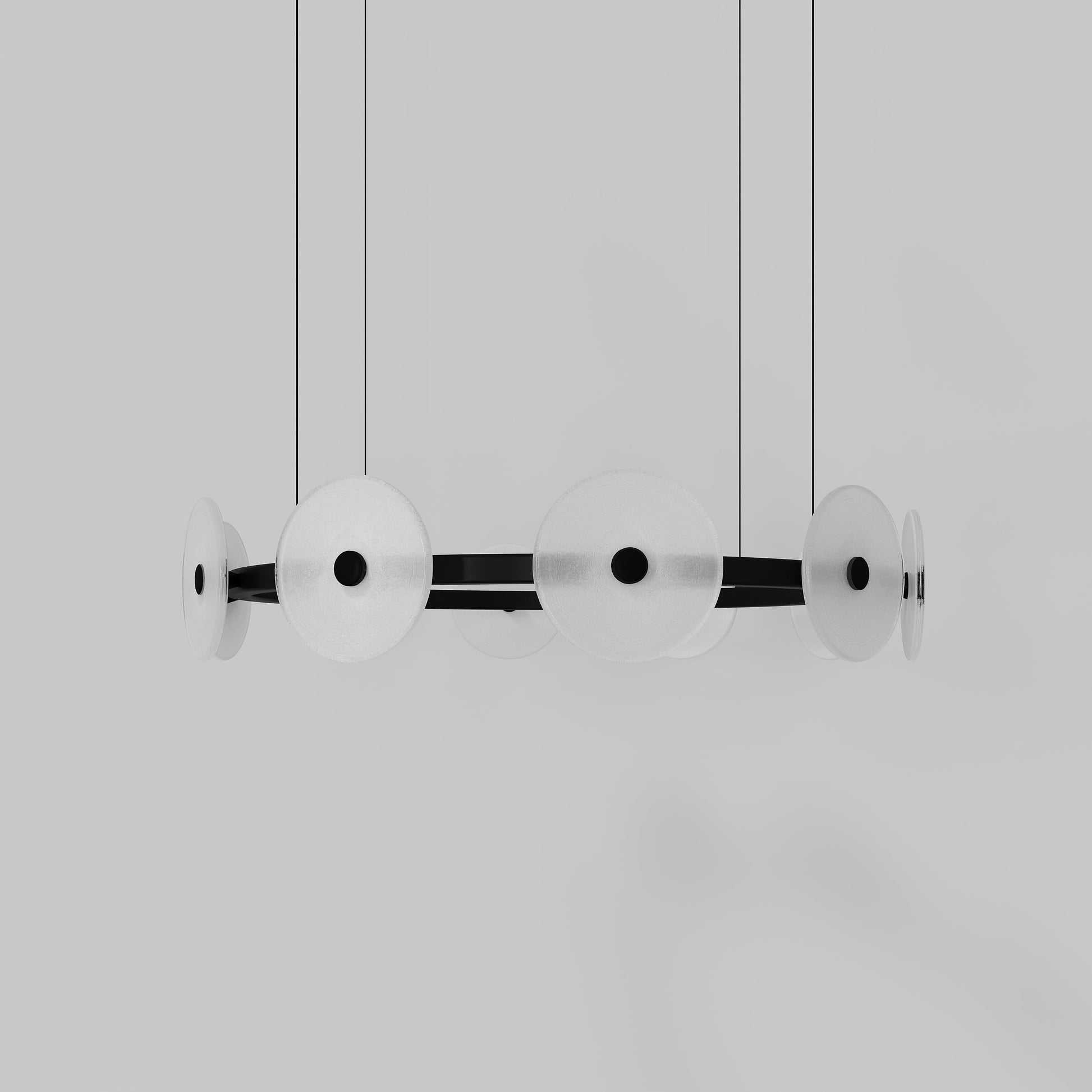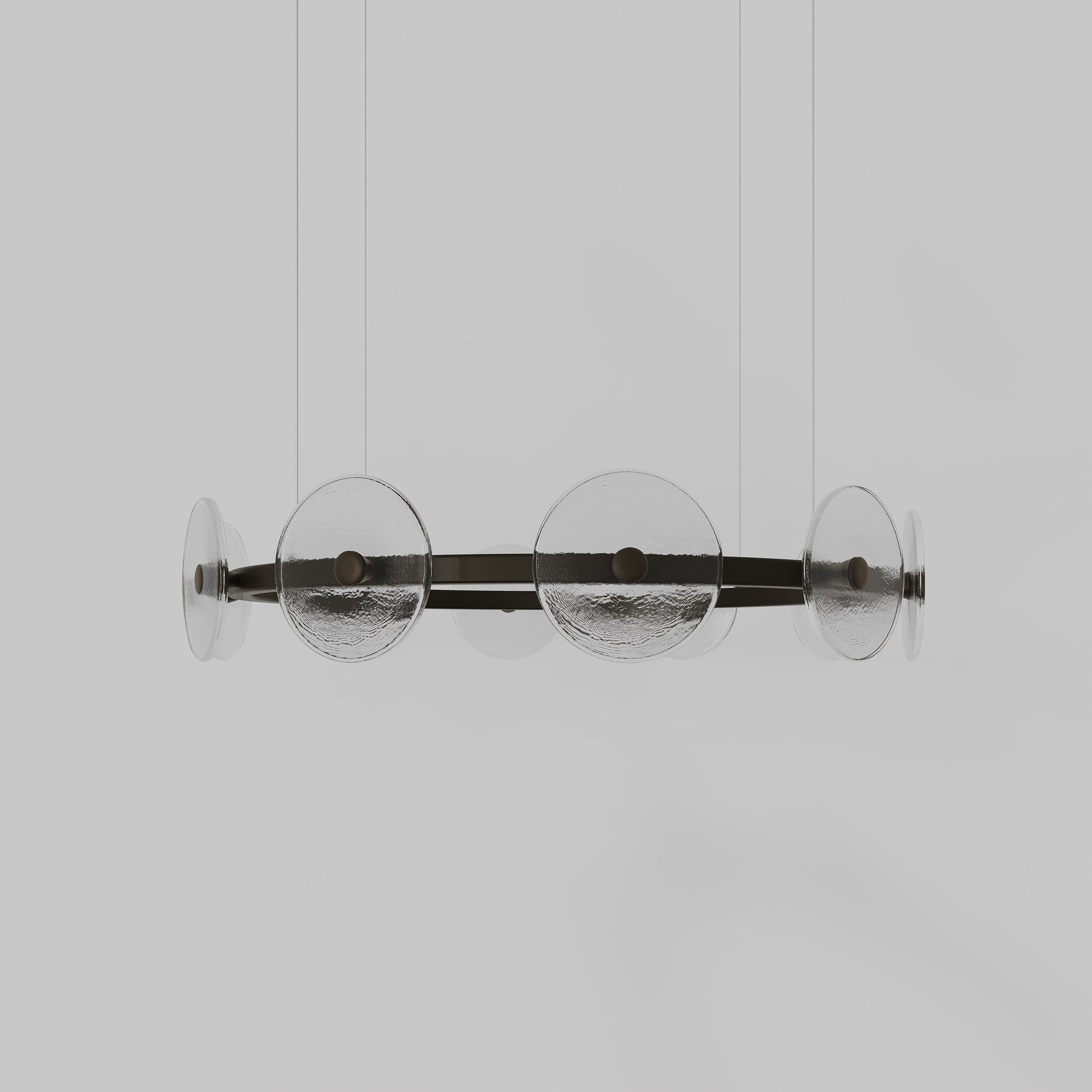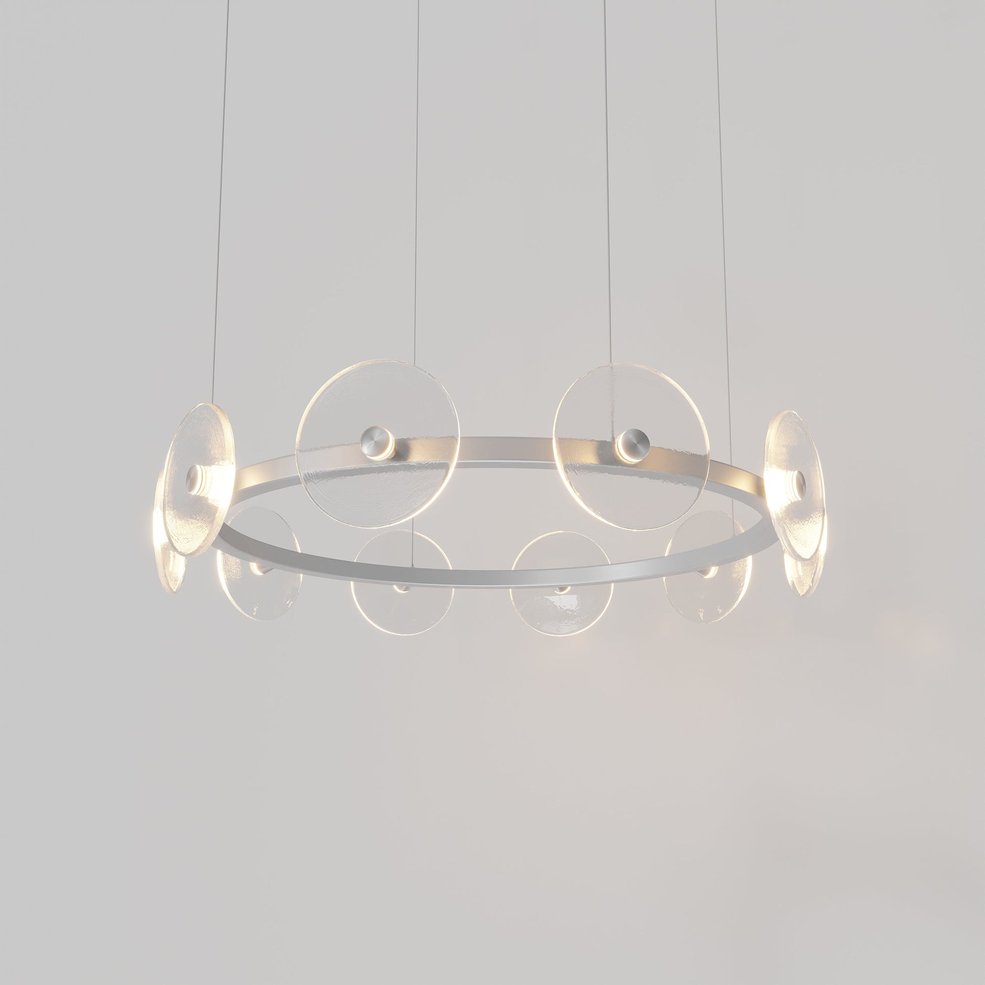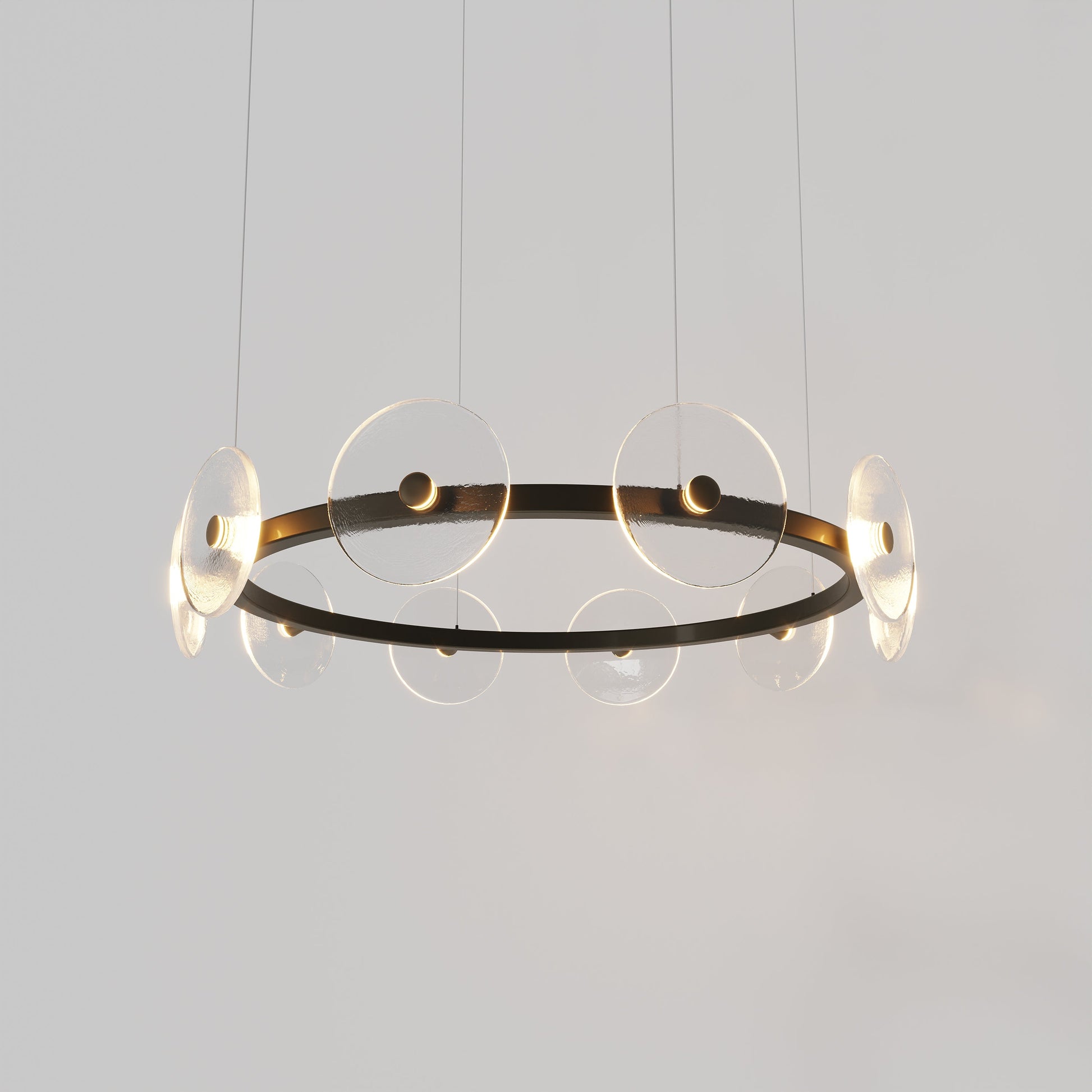 Adorn your space with the remarkable Coral Ring 10 pendant light. The circular ring base, available in a brass finish, matte black, matte white, and medium bronze finishes provides a striking canvas for the arrangement of ten individual hand-blown glass discs. This ring of modern art adds a distinctive touch of opulence to any space, particularly suited for hanging above dining tables, kitchen islands, or within an office space. Choose from a frosted or clear finish and set the mood of your space with a choice of warm, warm white, or white LED temperatures. Meticulously hand-blown using premium Swedish clear glass, each disc carries the distinctiveness of SOKTAS Glass designs, promising an unparalleled and personalised lighting masterpiece that adds both elegance and character to your space.