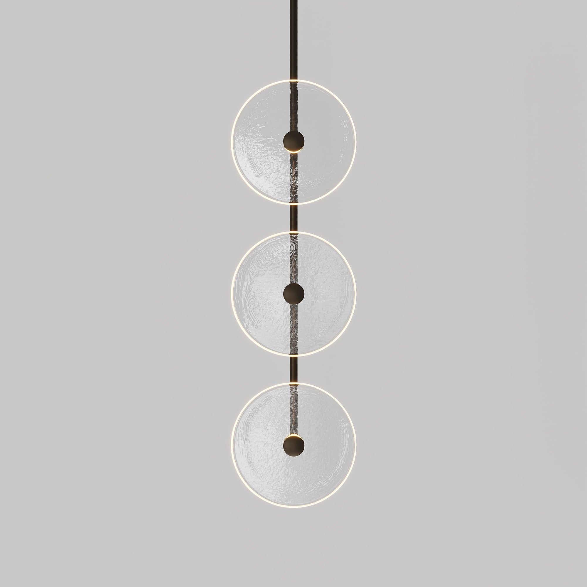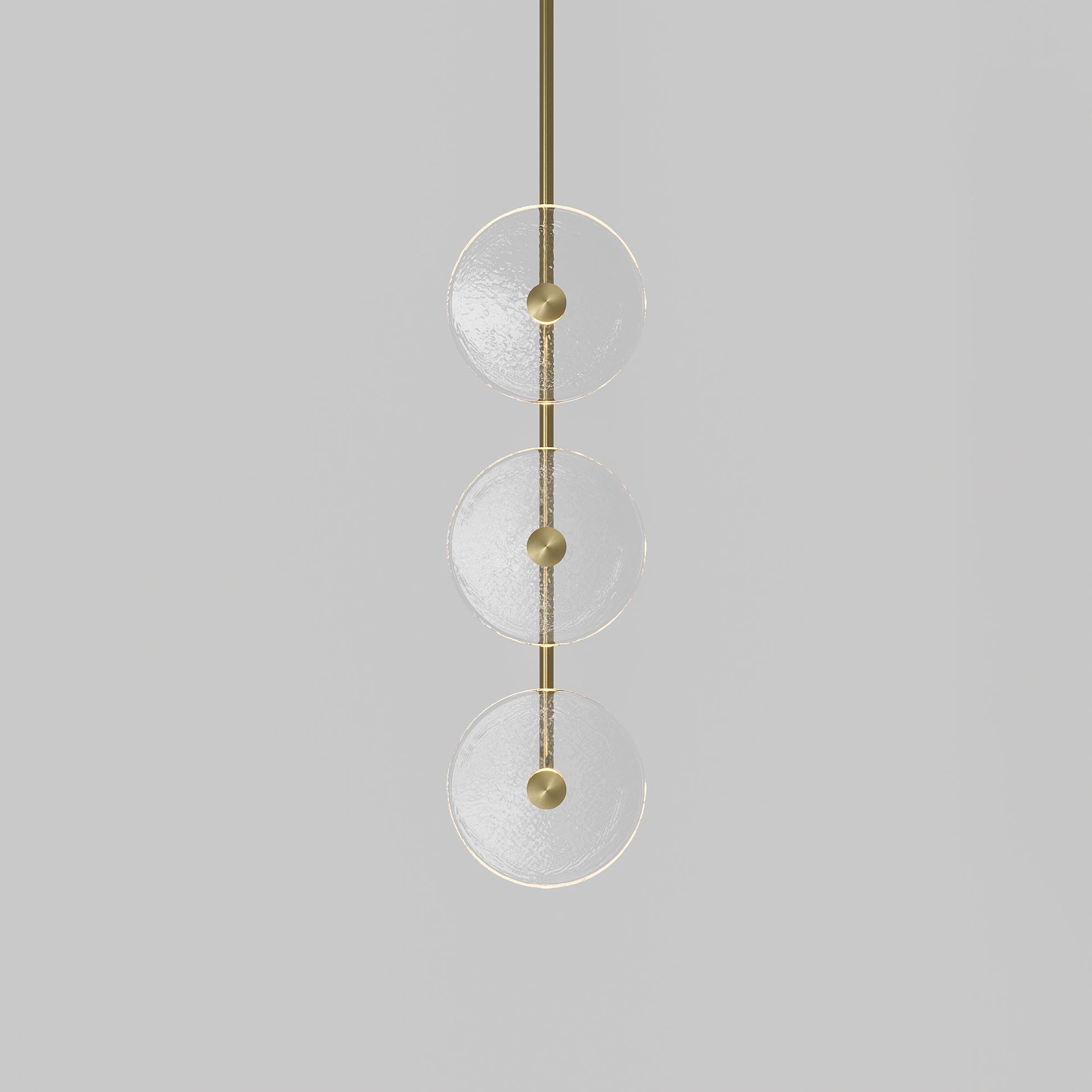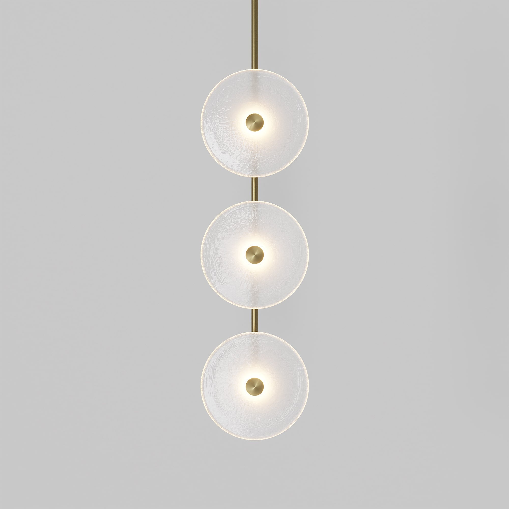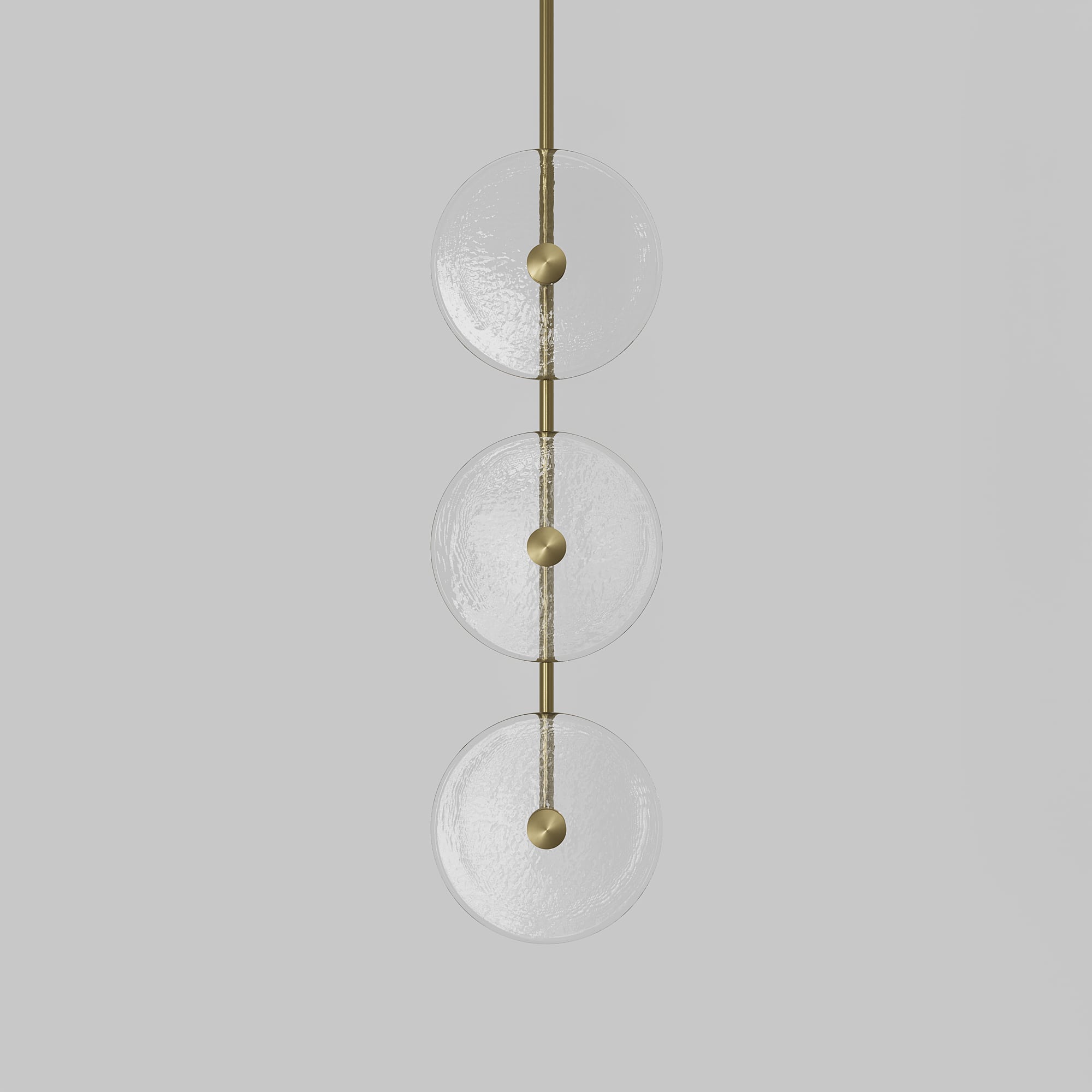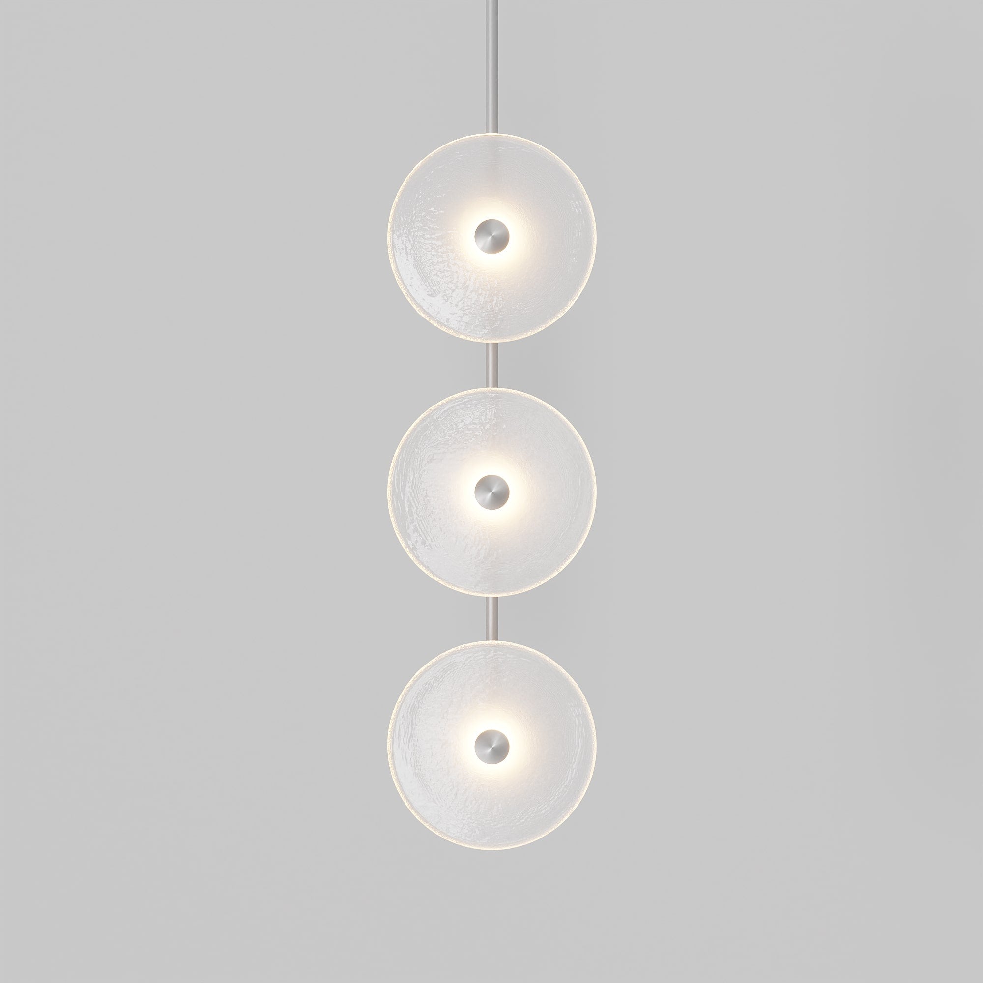 Elevate your space with the Coral Trio pendant light, a captivating modern centrepiece perfect for entryways, bathrooms, and kitchen islands. Three exquisite glass-blown discs are elegantly suspended from a rod, available in a selection of finishes including brass finish, steel finish, matte black, matte white, or medium bronze powder coating. Available in a centred or off-centred installation, opt for frosted or clear glass to match your style and set the mood with a choice of warm, warm white, or white LED temperatures. Meticulously hand-blown using premium Swedish clear glass, each disc carries the distinctiveness of SOKTAS Glass designs, promising an unparalleled and personalised lighting masterpiece that adds both elegance and character to your space.