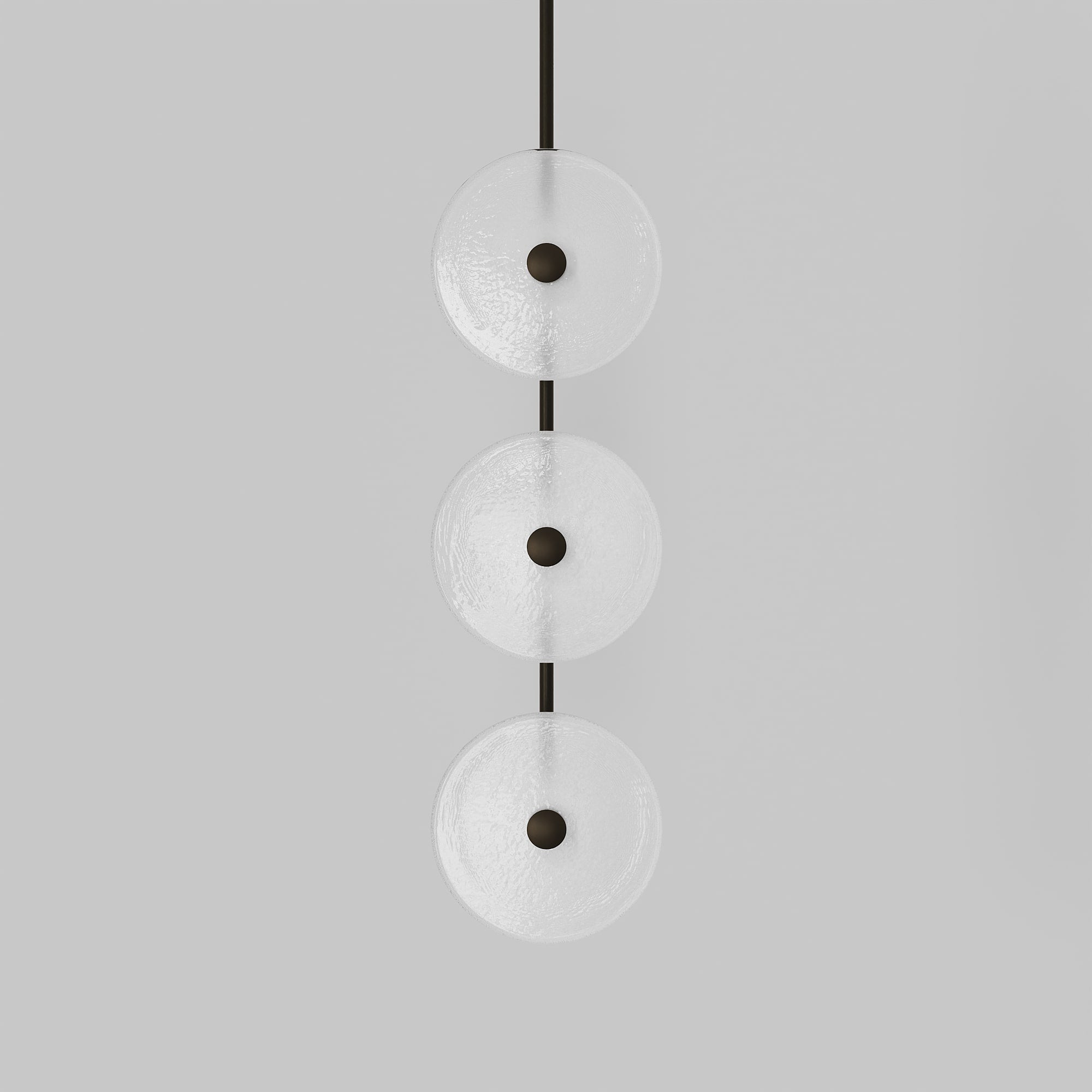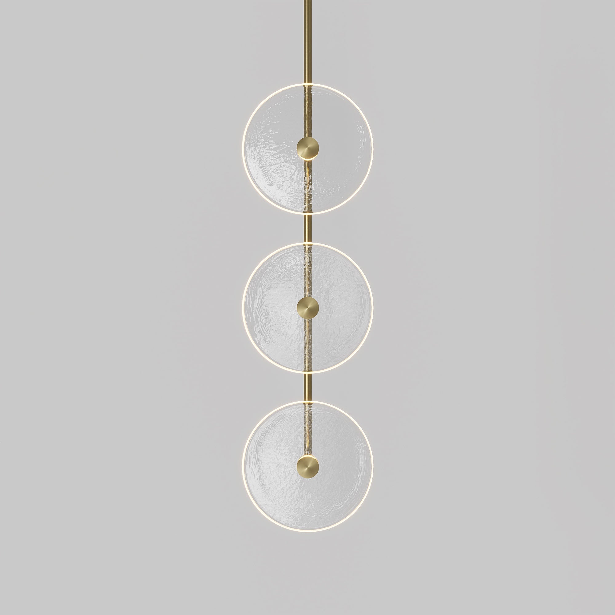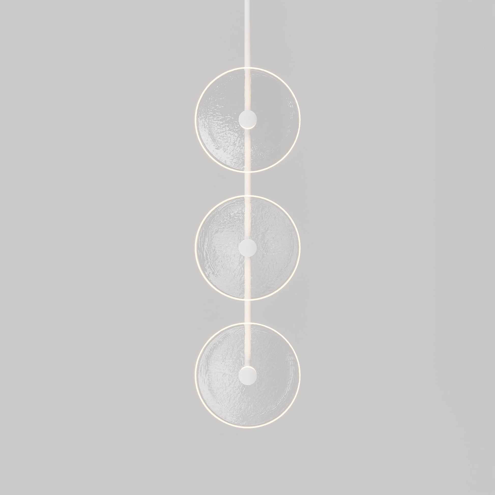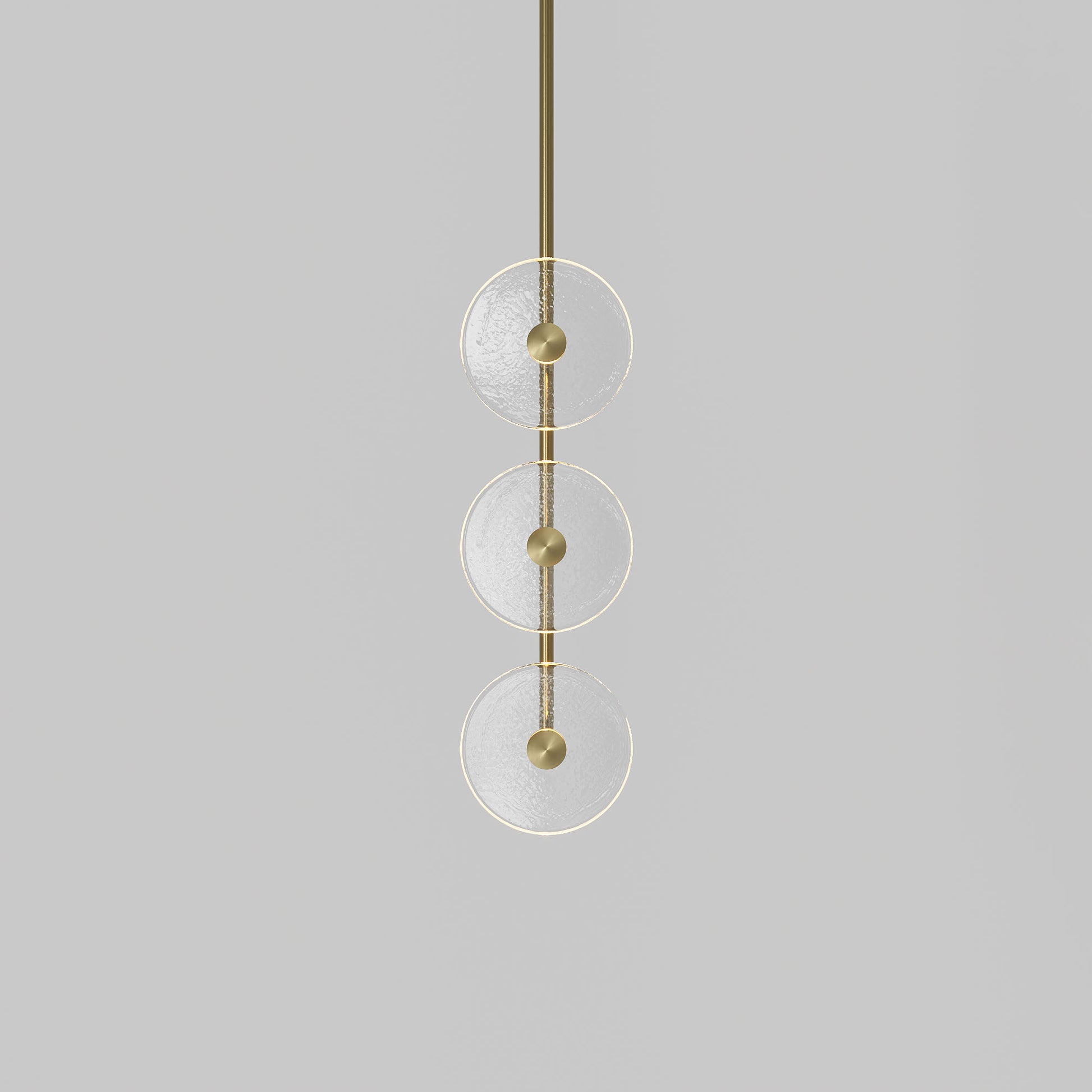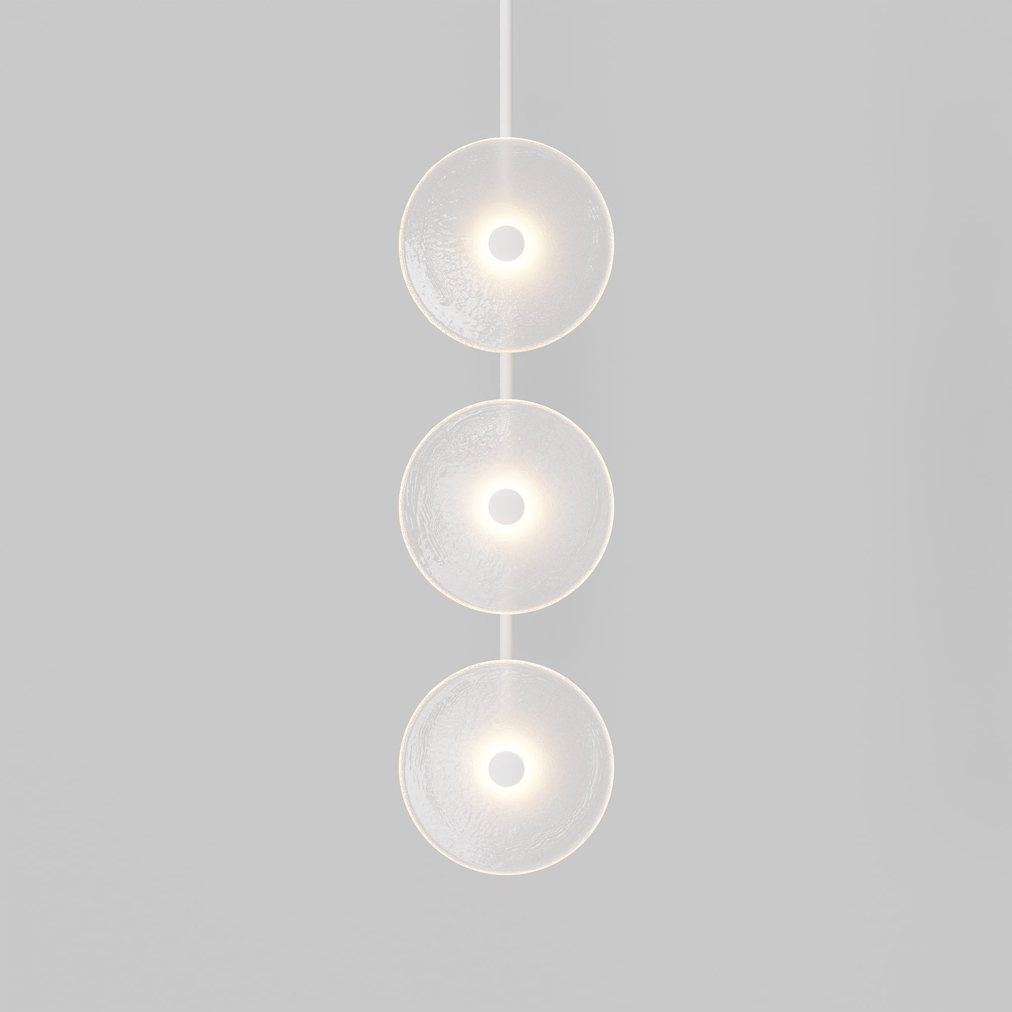 Elevate your space with the Coral Trio pendant light, a captivating modern centrepiece perfect for entryways, bathrooms, and kitchen islands. Three exquisite glass-blown discs are elegantly suspended from a rod, available in a selection of finishes including brass finish, steel finish, matte black, matte white, or medium bronze powder coating. Available in a centred or off-centred installation, opt for frosted or clear glass to match your style and set the mood with a choice of warm, warm white, or white LED temperatures. Meticulously hand-blown using premium Swedish clear glass, each disc carries the distinctiveness of SOKTAS Glass designs, promising an unparalleled and personalised lighting masterpiece that adds both elegance and character to your space.