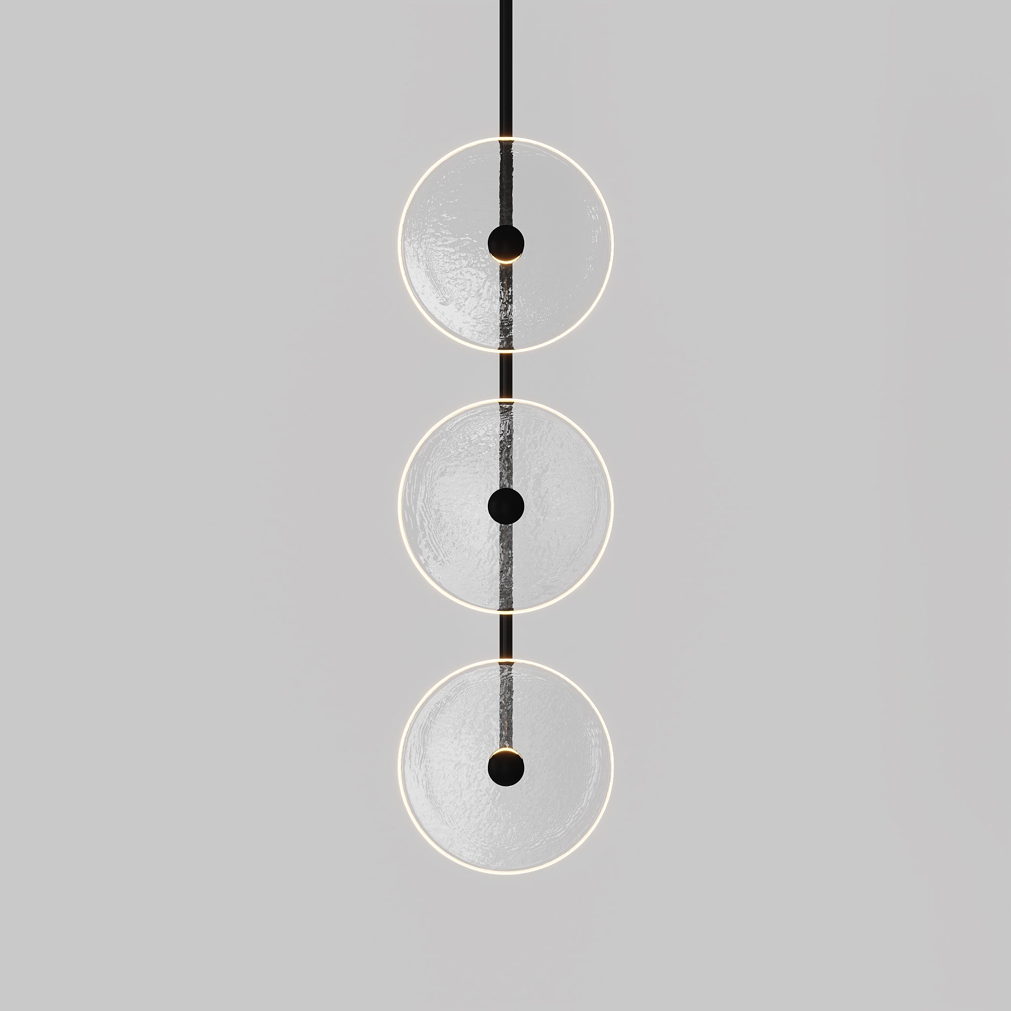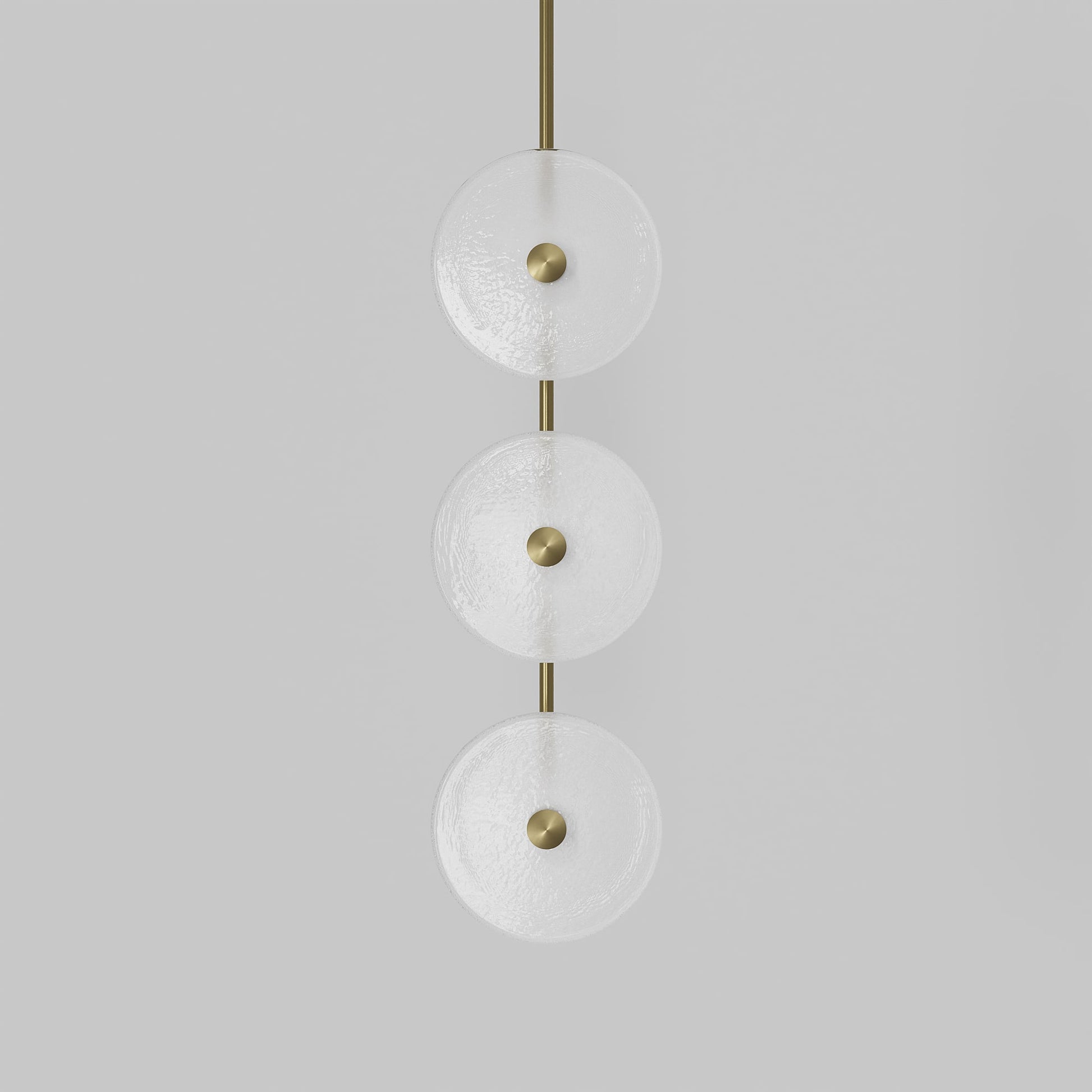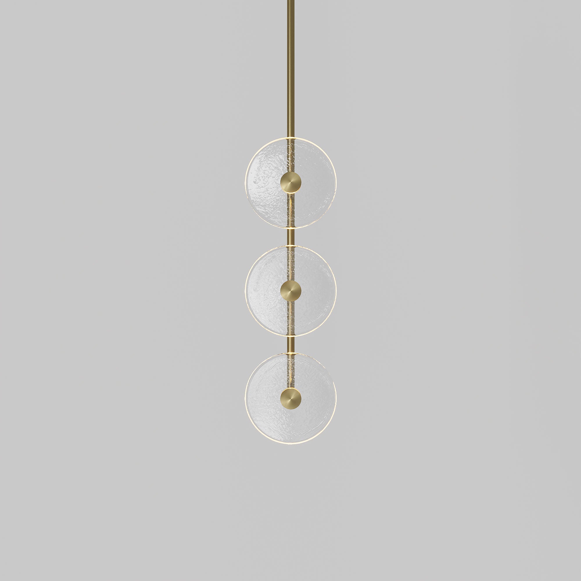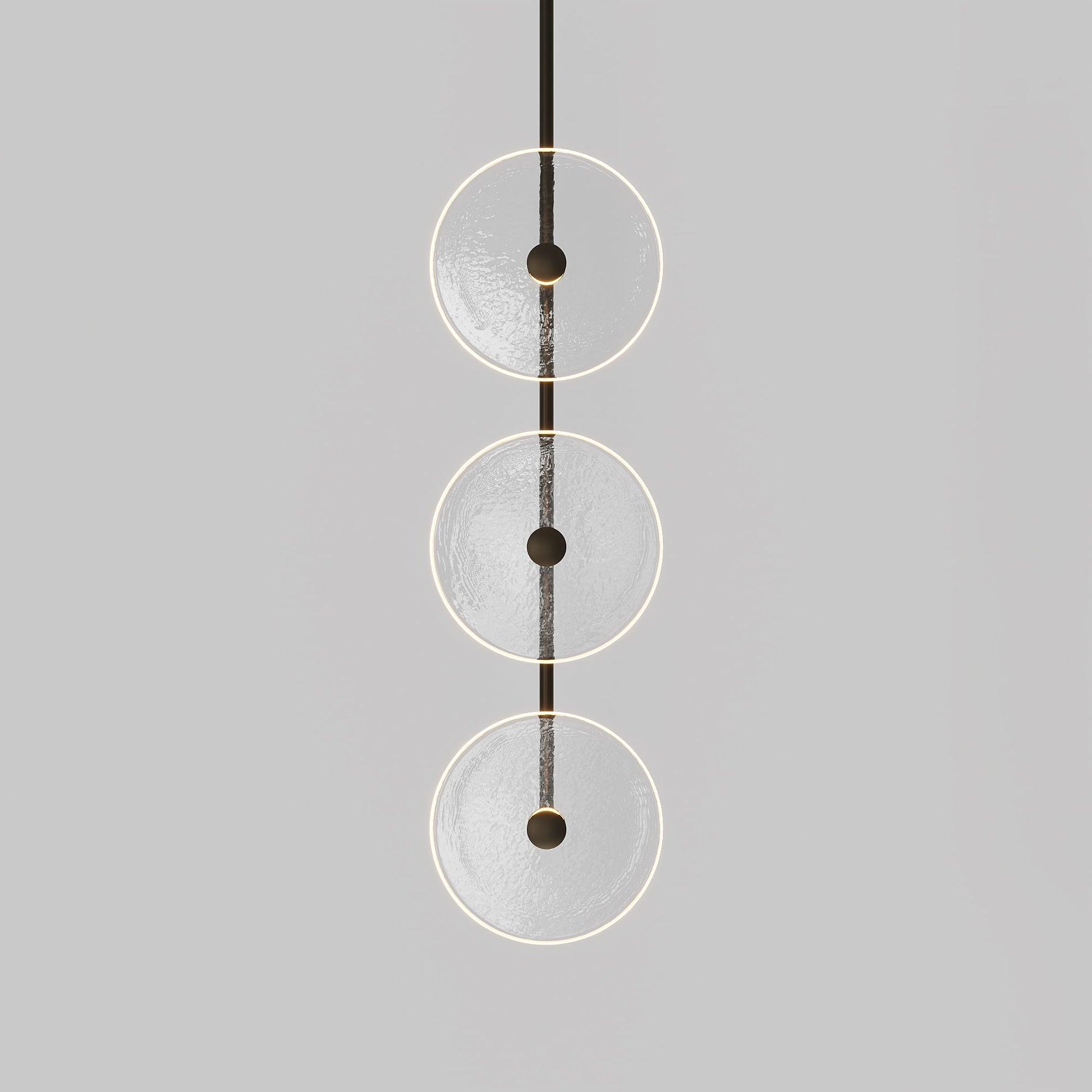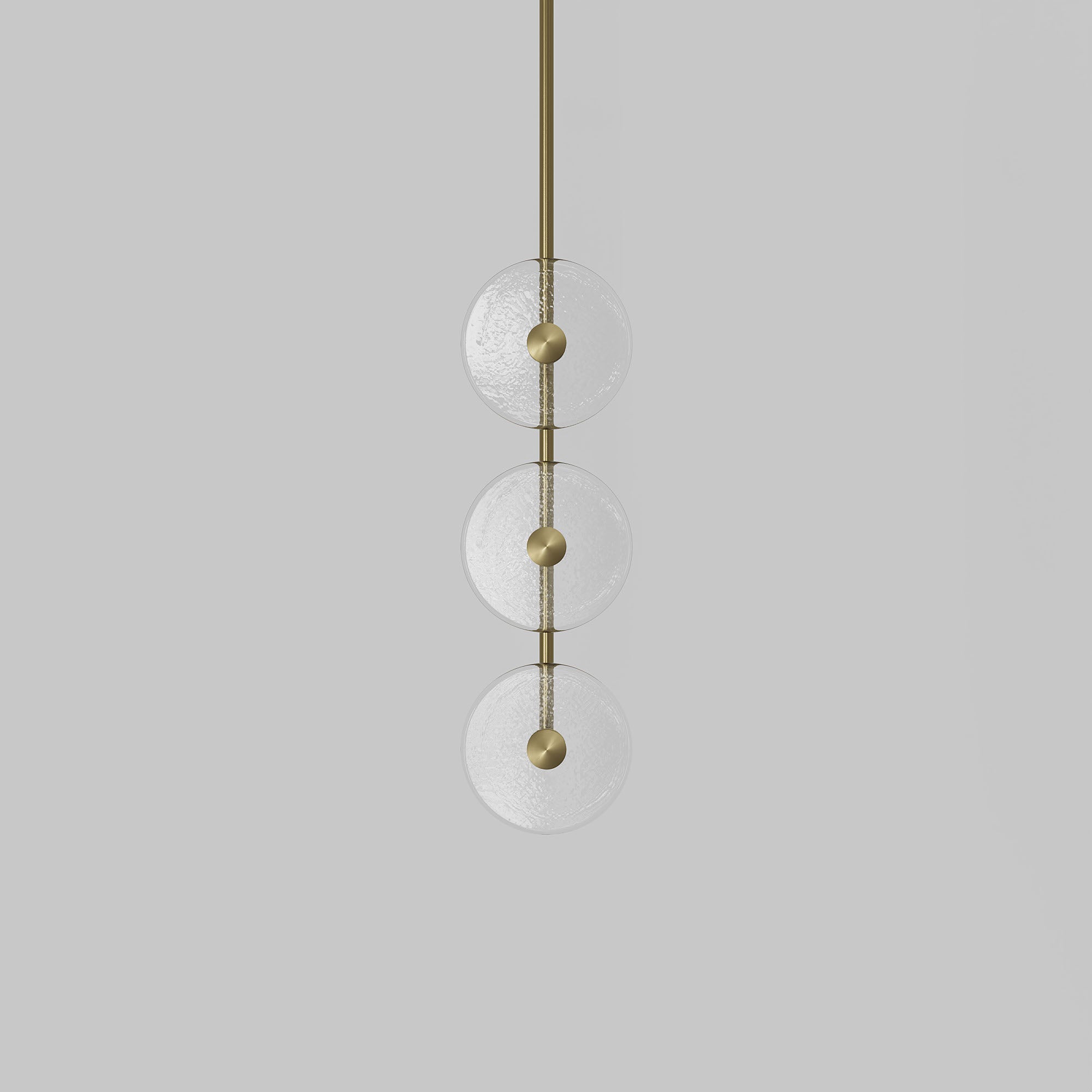 Elevate your space with the Coral Trio pendant light, a captivating modern centrepiece perfect for entryways, bathrooms, and kitchen islands. Three exquisite glass-blown discs are elegantly suspended from a rod, available in a selection of finishes including brass finish, steel finish, matte black, matte white, or medium bronze powder coating. Available in a centred or off-centred installation, opt for frosted or clear glass to match your style and set the mood with a choice of warm, warm white, or white LED temperatures. Meticulously hand-blown using premium Swedish clear glass, each disc carries the distinctiveness of SOKTAS Glass designs, promising an unparalleled and personalised lighting masterpiece that adds both elegance and character to your space.