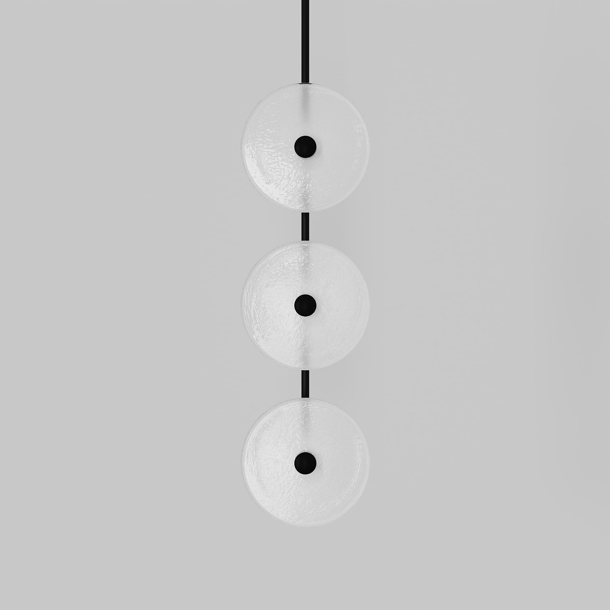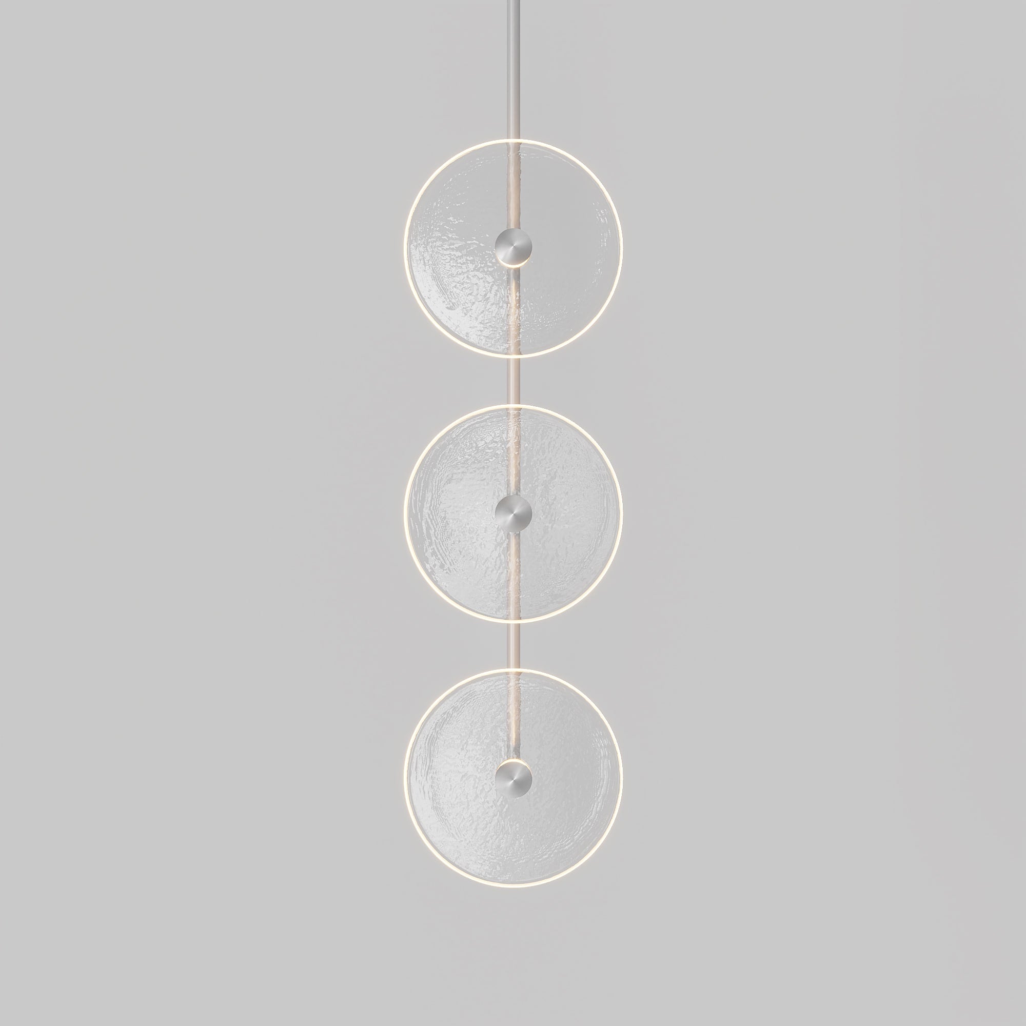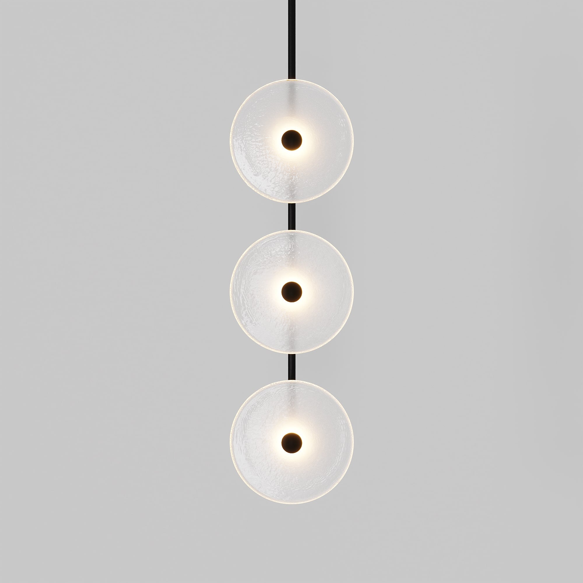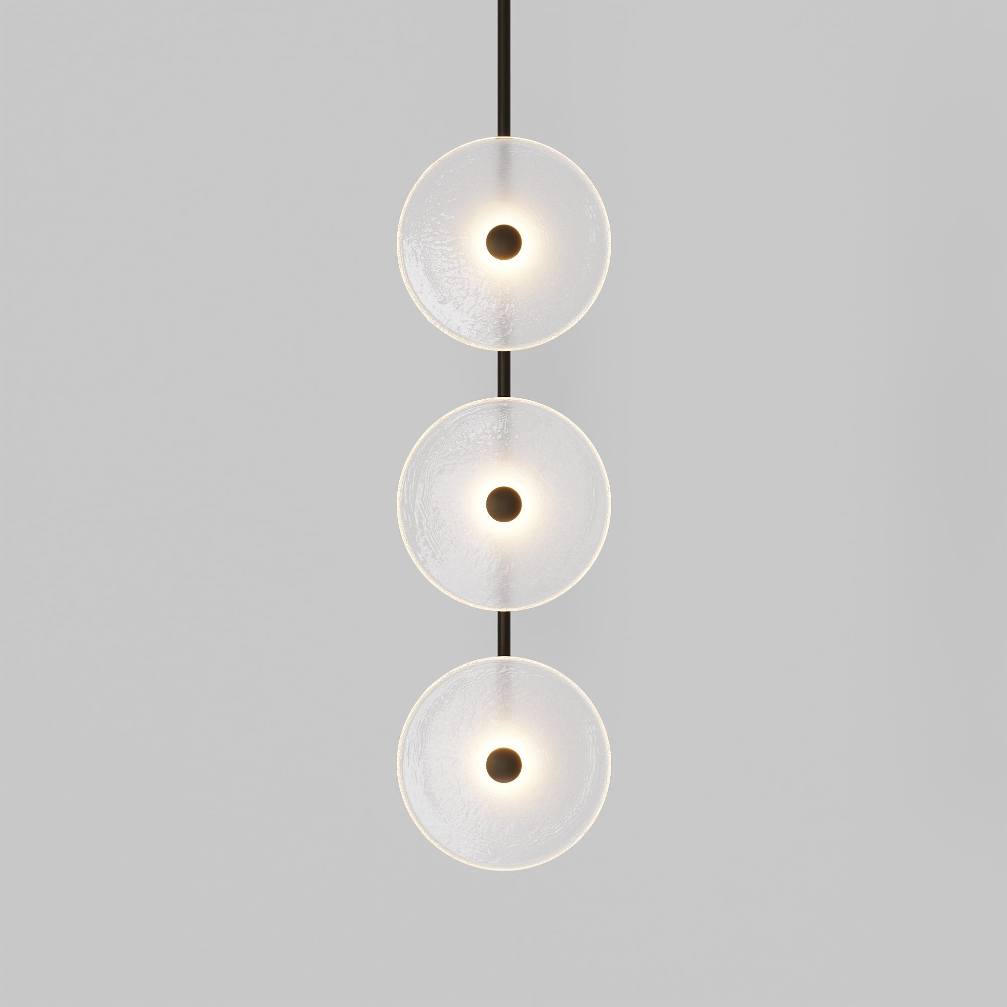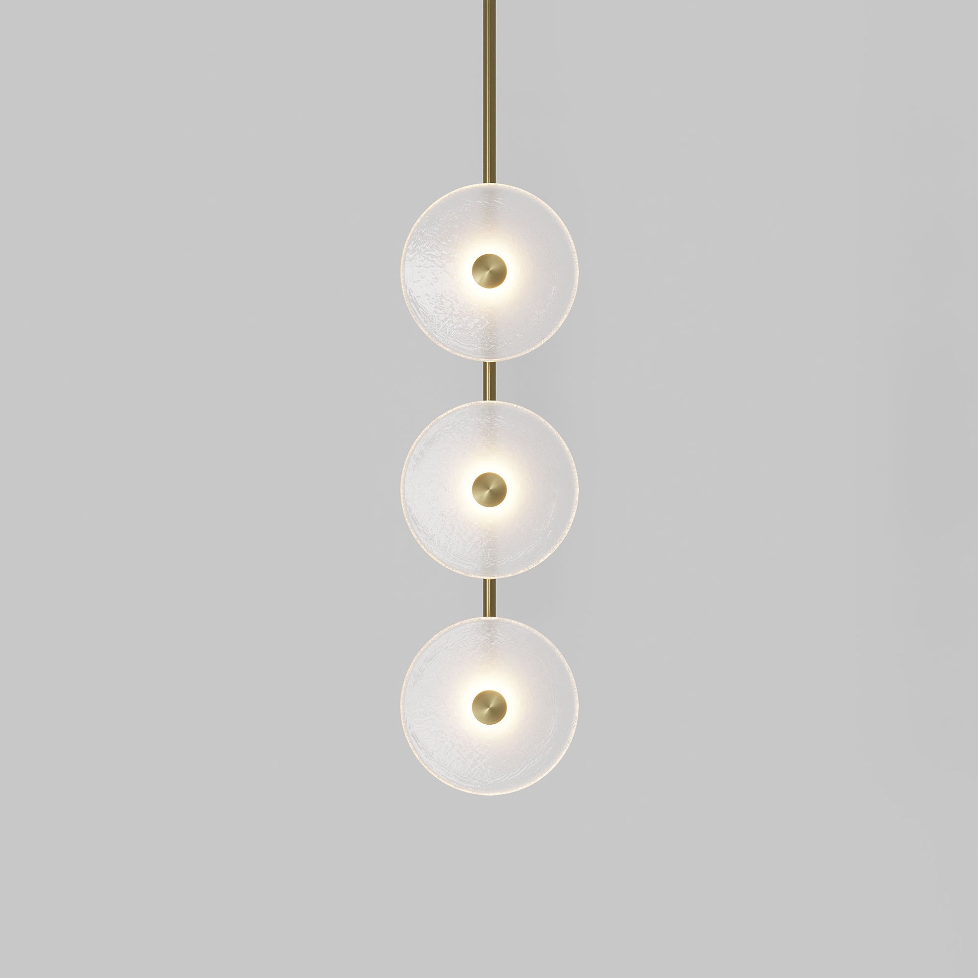 Elevate your space with the Coral Trio pendant light, a captivating modern centrepiece perfect for entryways, bathrooms, and kitchen islands. Three exquisite glass-blown discs are elegantly suspended from a rod, available in a selection of finishes including brass finish, steel finish, matte black, matte white, or medium bronze powder coating. Available in a centred or off-centred installation, opt for frosted or clear glass to match your style and set the mood with a choice of warm, warm white, or white LED temperatures. Meticulously hand-blown using premium Swedish clear glass, each disc carries the distinctiveness of SOKTAS Glass designs, promising an unparalleled and personalised lighting masterpiece that adds both elegance and character to your space.